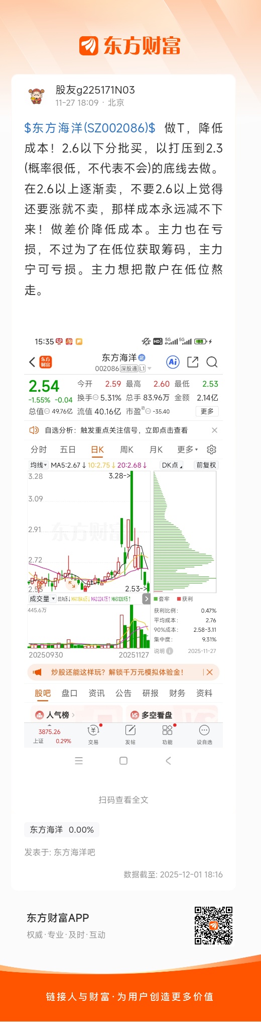 $东方海洋(SZ002086)$ 做T,降低成本!2.6以下分批买,以打压到2.3(概率很低,不代表不会)的底线去做。在2.6以上逐渐卖,不要2.6以上觉得还要涨就不卖,那样成本永远减不下来!做差价降低成本。主力也在亏损,不过为了在低位获取筹码,主力宁可亏损。主力想把散户在低位熬走。