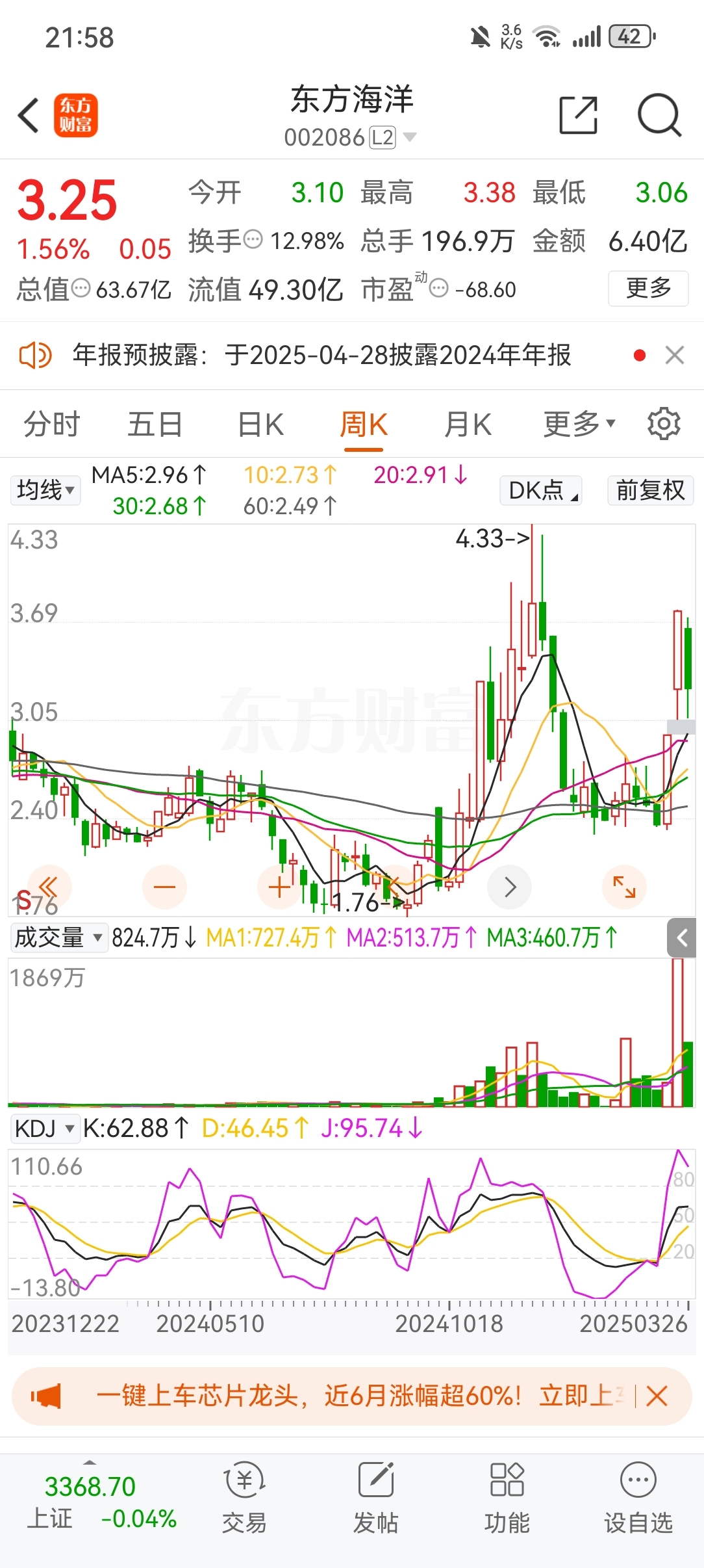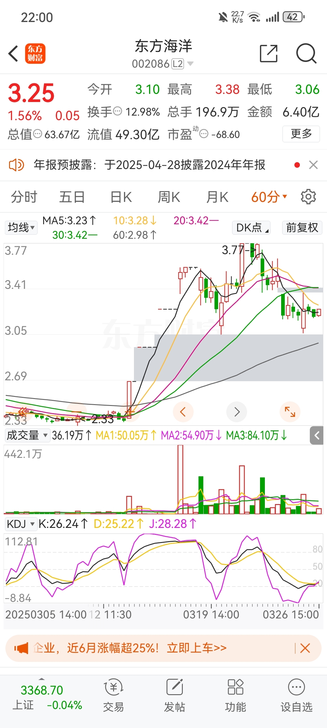 2024年9月18日的1.76元是一浪起点,一直涨到4.33元。随后二浪回调,二浪回调的时间、空间和底部的扎实度,都很是完美。2025年3月13日的一根放量涨停板,宣告了三浪的开始,目前进行的是3浪2回调,今天的低点3.06元个人认为就是3浪2的最低点,3浪3,从明天开始吧,主力,看你表演!