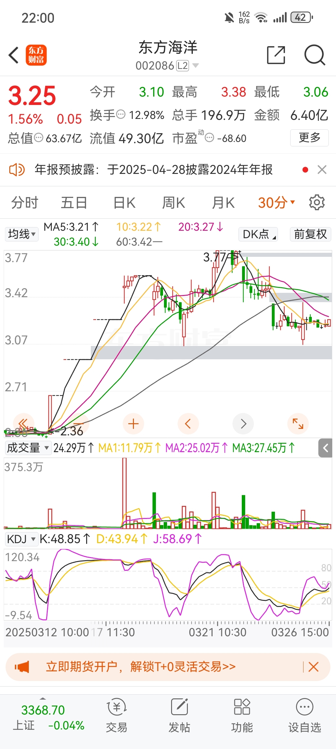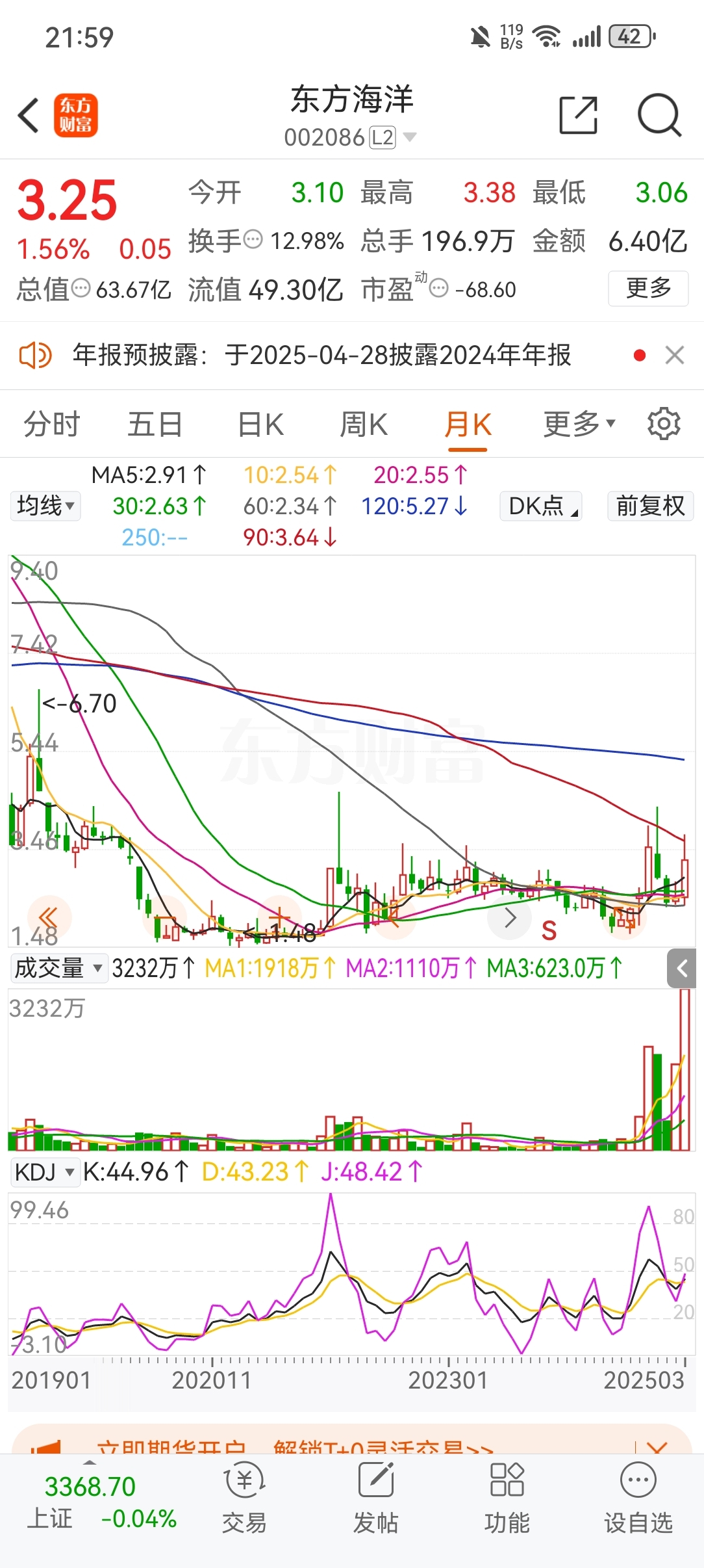 $东方海洋(SZ002086)$ 以下是东方海洋个人技术分析见解,从量能K线图、波浪理论两个方面进行讲述。
