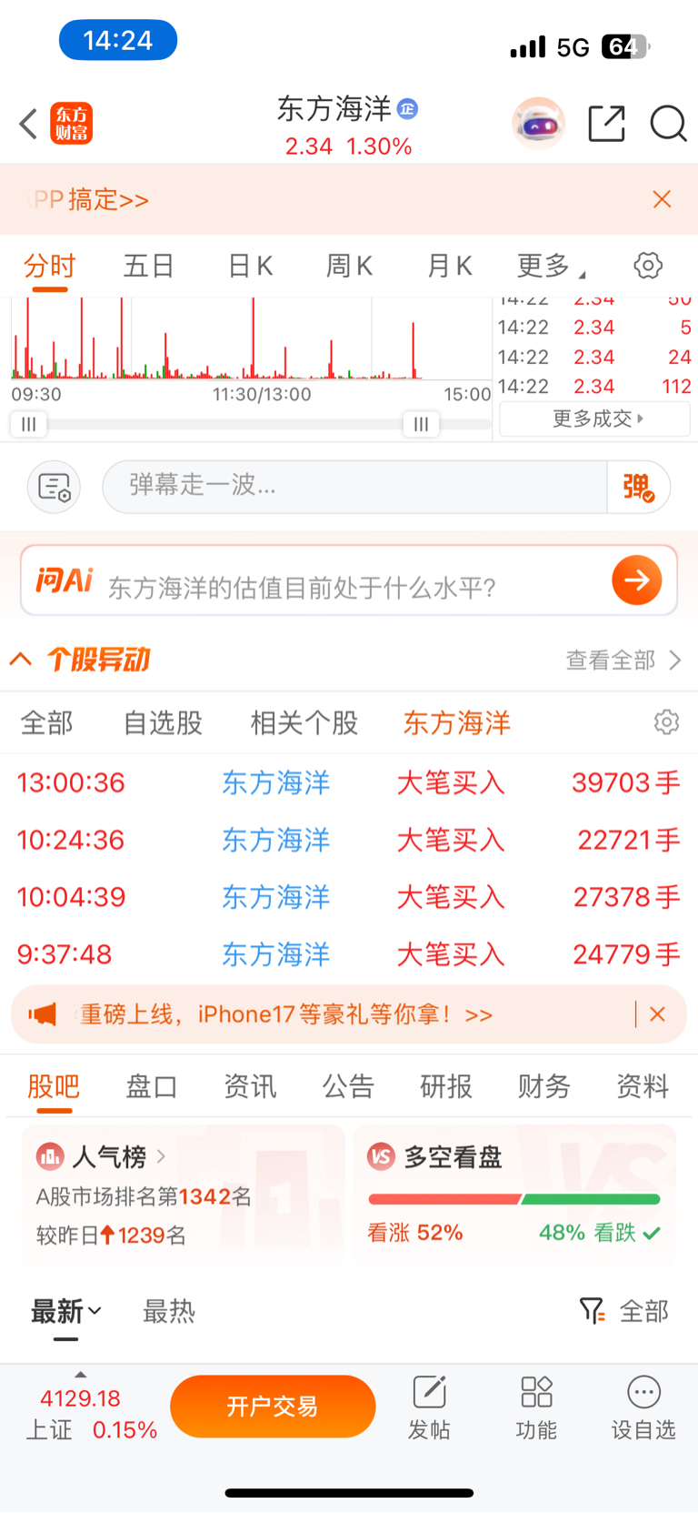 $东方海洋(SZ002086)$ 这两天有这么多大单进去,有什么好消息吗?