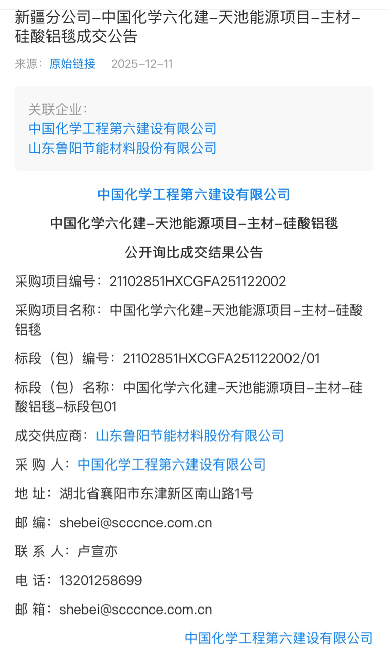 中国化学六化建-天池能源项目-主材-硅酸铝毯中标单位:鲁阳节能