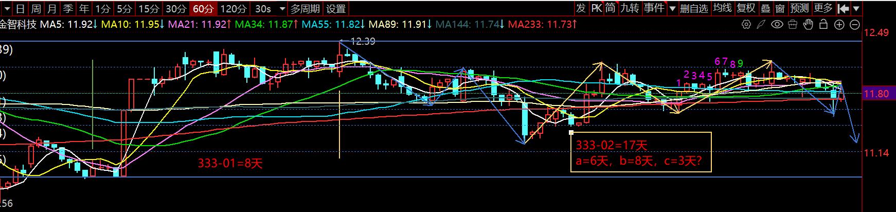 金智下周还要下跌调整3天左右,从12.39高点开始的调整浪,到11.24走完A段,到今天高点12.15完成B段反弹,下周C段下跌最少3天。所以前天的减仓去补了新华都,今天的清仓补了金富,也不算亏。