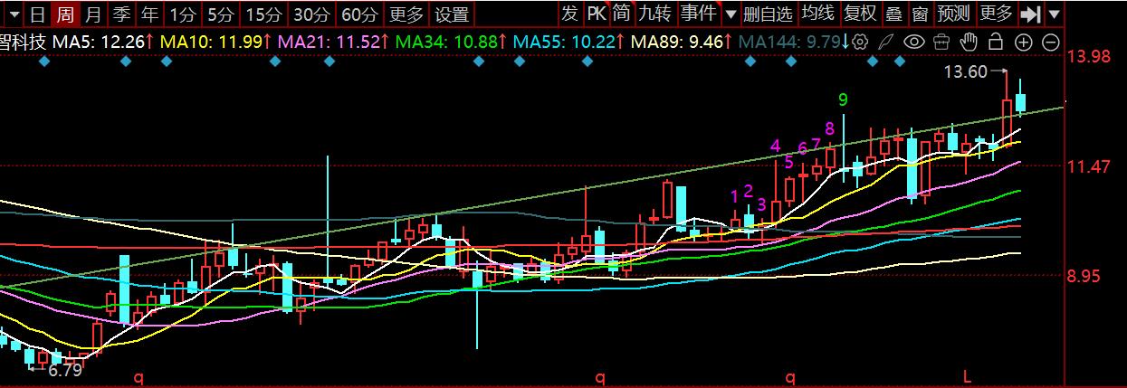 金智,12-15号再向下调整一天,大概率就11.60调整到位,主力如果要极限施压,小概率到11.45,还需要大盘跳水大环境配合。我进场早了几天,周五11.97大幅减仓,等下周一低点接回来成本能降到11.90以下。金智周线有个上升通道上轨压力,已经进入333浪,下周必须放量冲过去。