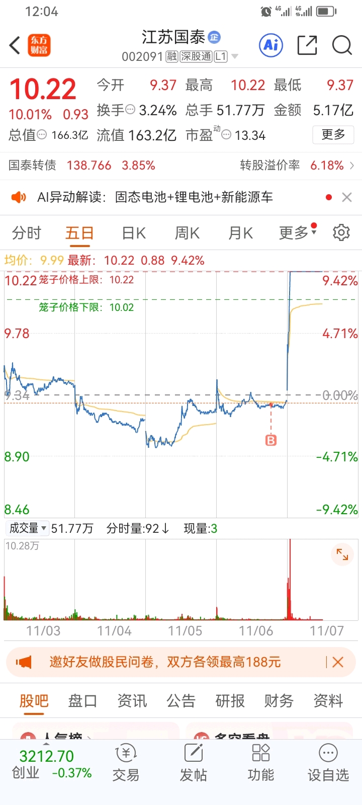 $江苏国泰(SZ002091)$ 才打了个底仓你就涨停了,还想着今天跌下来加点仓呢