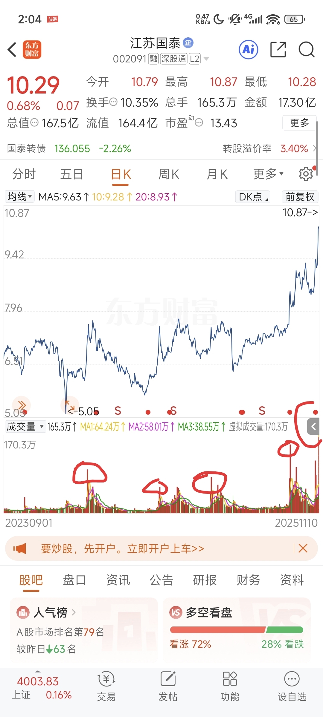 $江苏国泰(SZ002091)$ 是巧合还是规律?每次成交量放巨量都会经历或多或少的回调,没有意外,不知道这波跌多久,但是可以确定的是大概率会下跌
