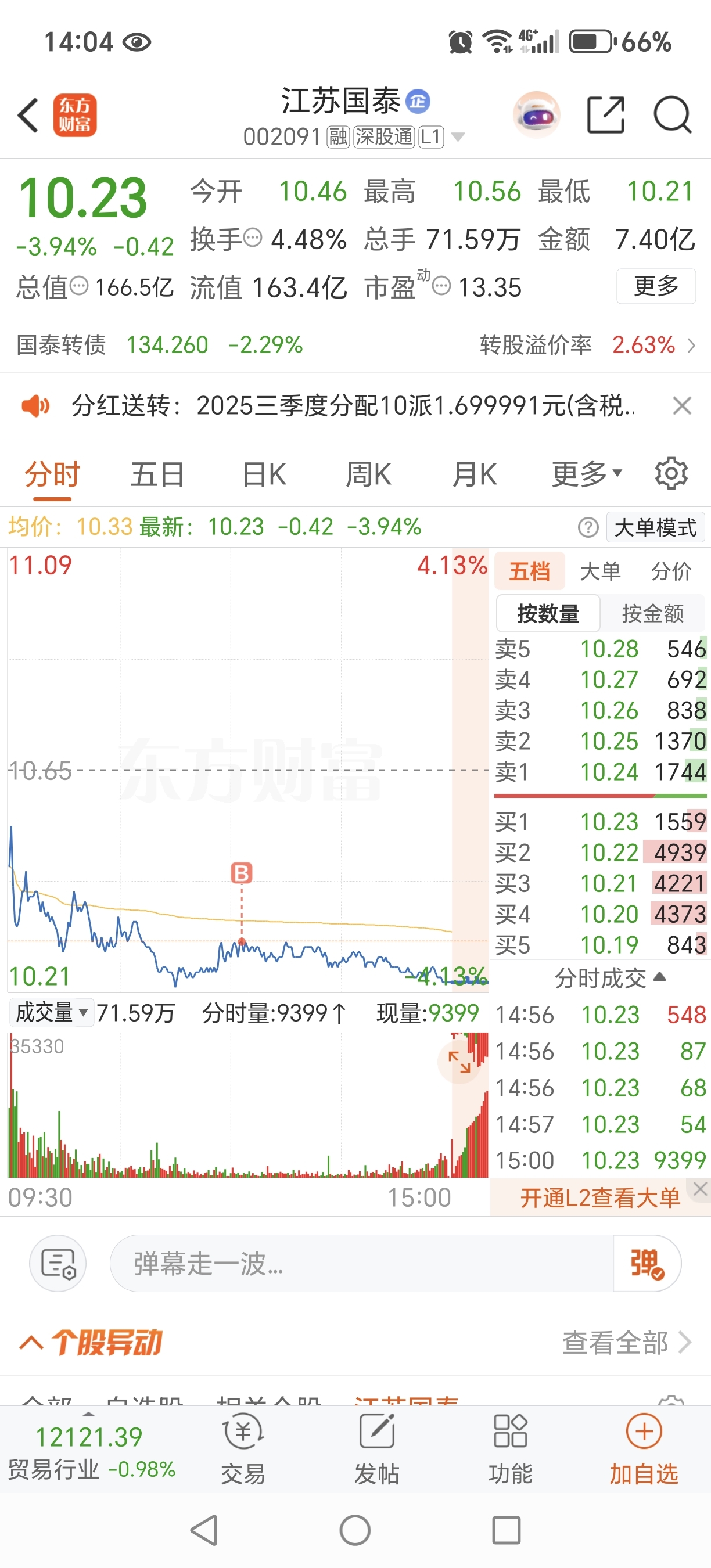 $江苏国泰(SZ002091)$ 买进去给你们分红了