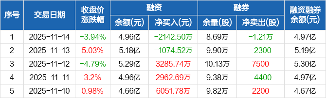 江苏国泰:融资净偿还2142.5万元,融资余额4.96亿元(11-14)