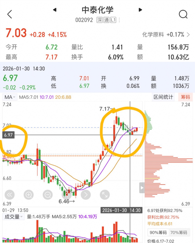 $中泰化学(SZ002092)$ 这个主力 很会玩,盘中就完成回调了 早盘诱多 下杀吸筹 然后回踩到五日 继续震荡吸筹 到了6.97 不拉了 一直护盘 太会玩了拿捏各种本来就觉得能跌呀blablba的哈哈哈哈 你们这种啊 就适合追白银