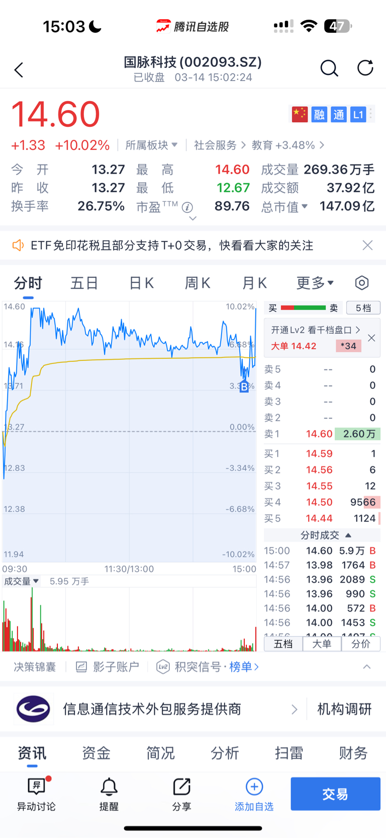 $国脉科技(SZ002093)$ 尾盘14.7又买回点国脉