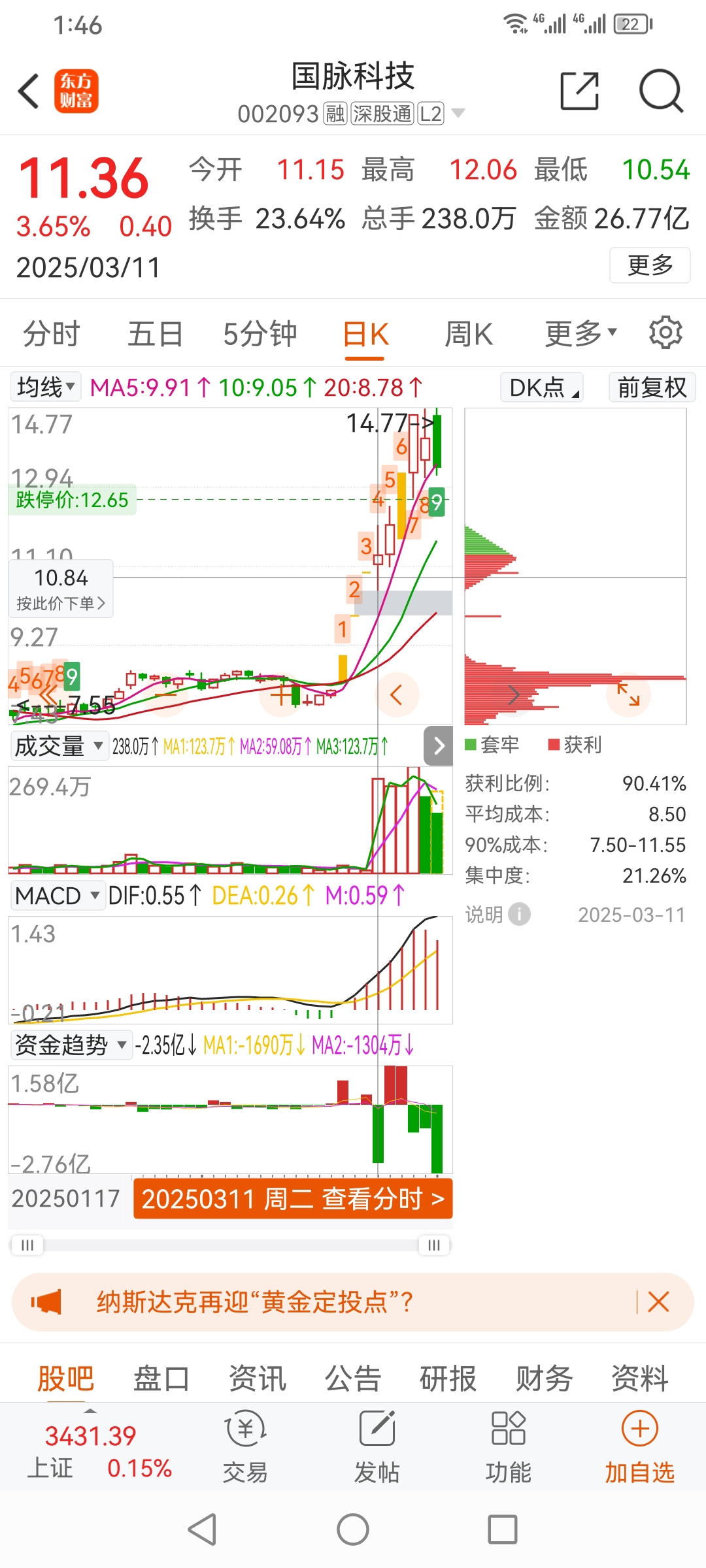 $国脉科技(SZ002093)$ 军哥 打板,竞价,6G,均线向上。设置阴线,割股。跟大单打板,002570贝因美。#炒股日记#