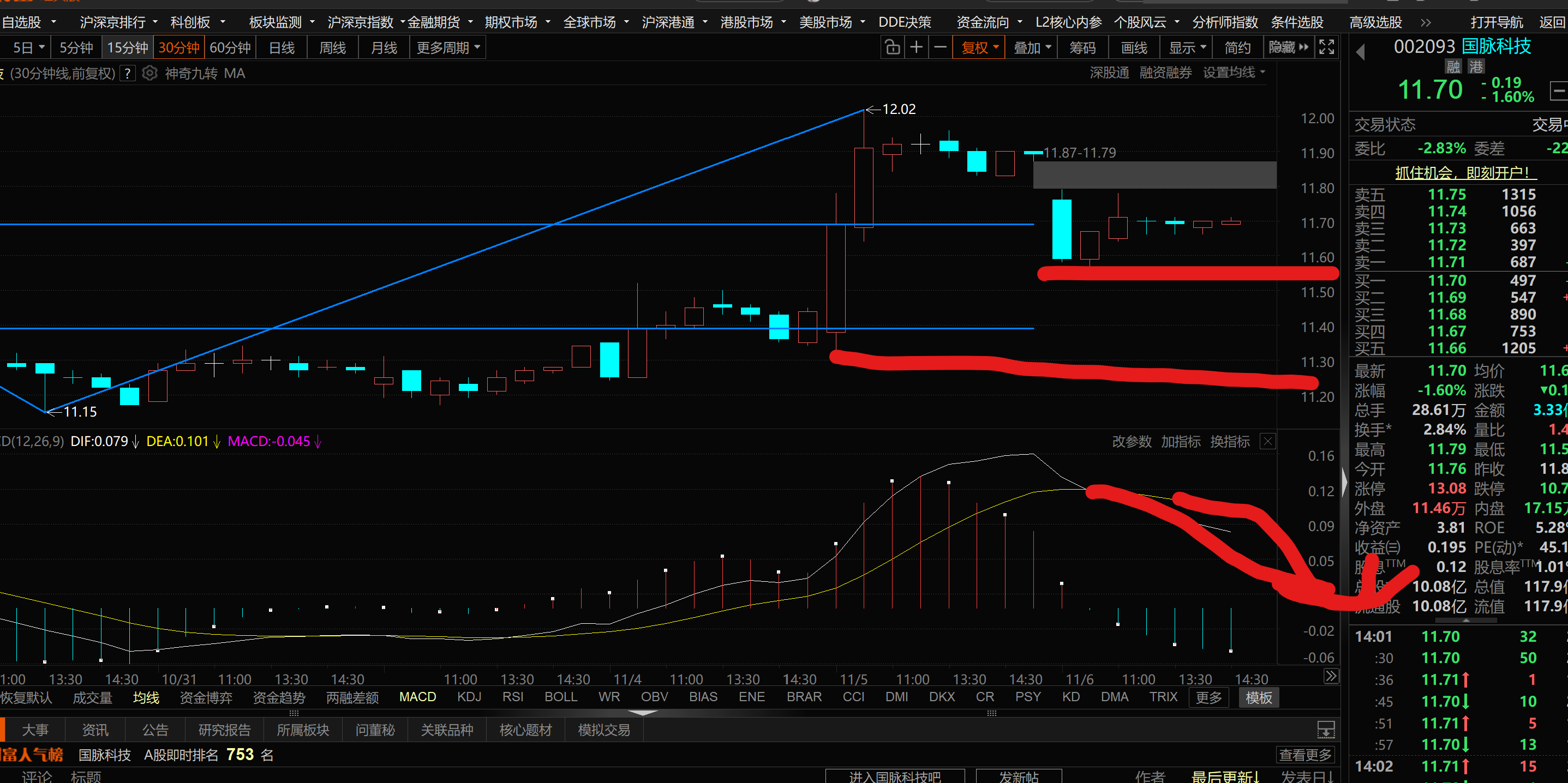 放到今天走势图来看 11.56-11.77这样 没有打破 今天高点 11.79