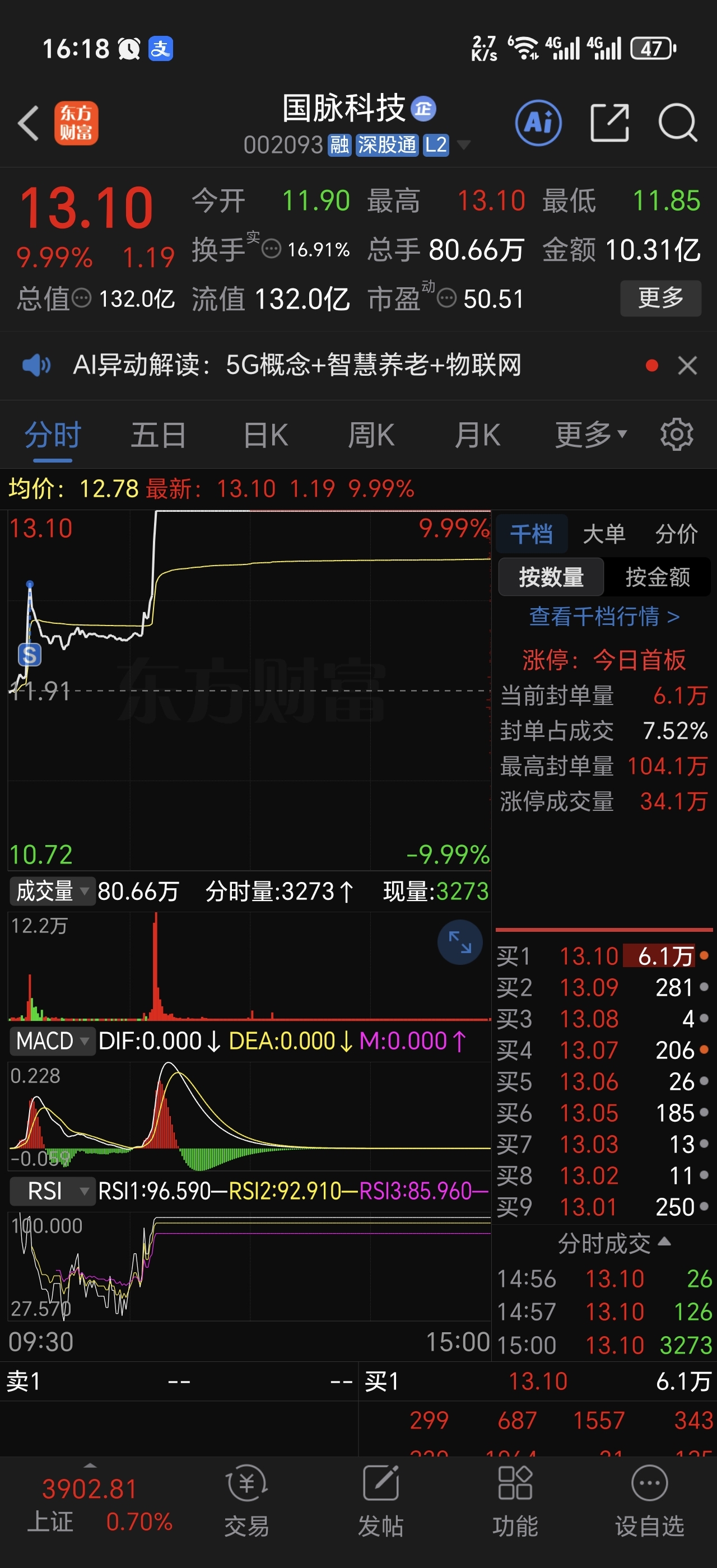 $国脉科技(SZ002093)$ 犹豫好久都没买回来,留下的兄弟发财