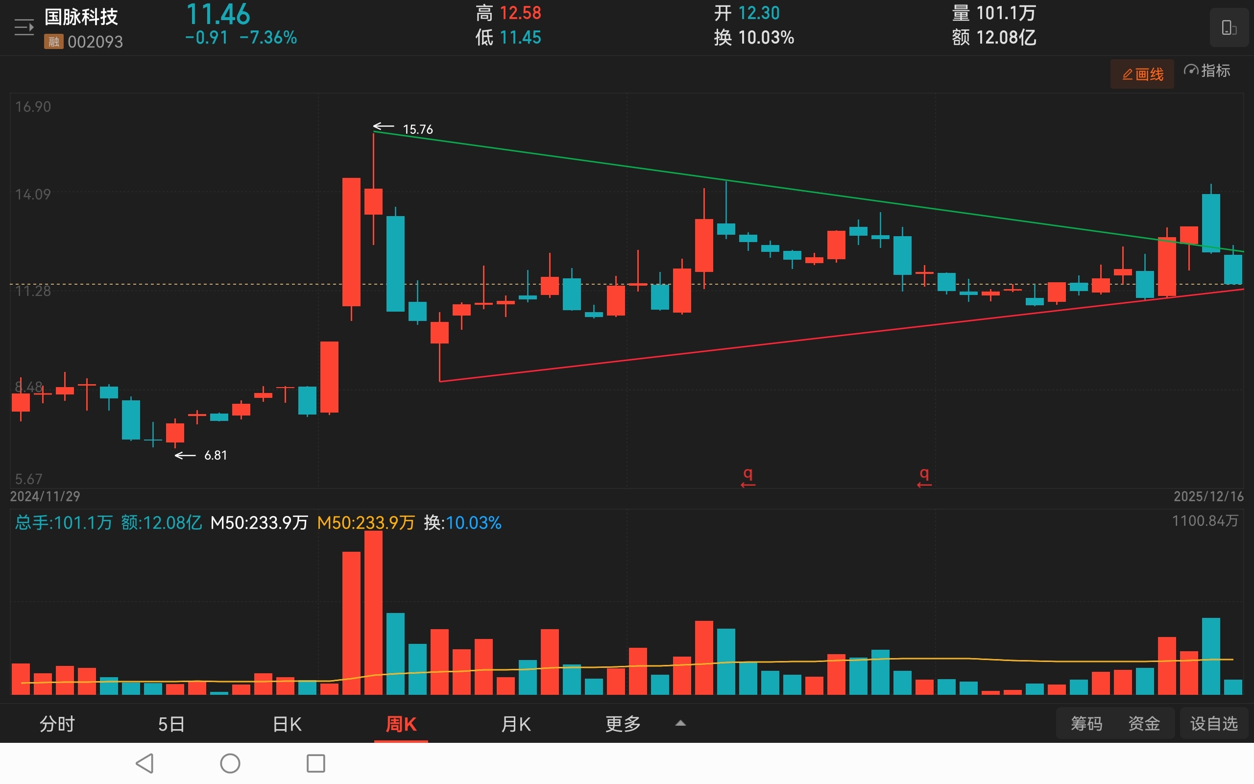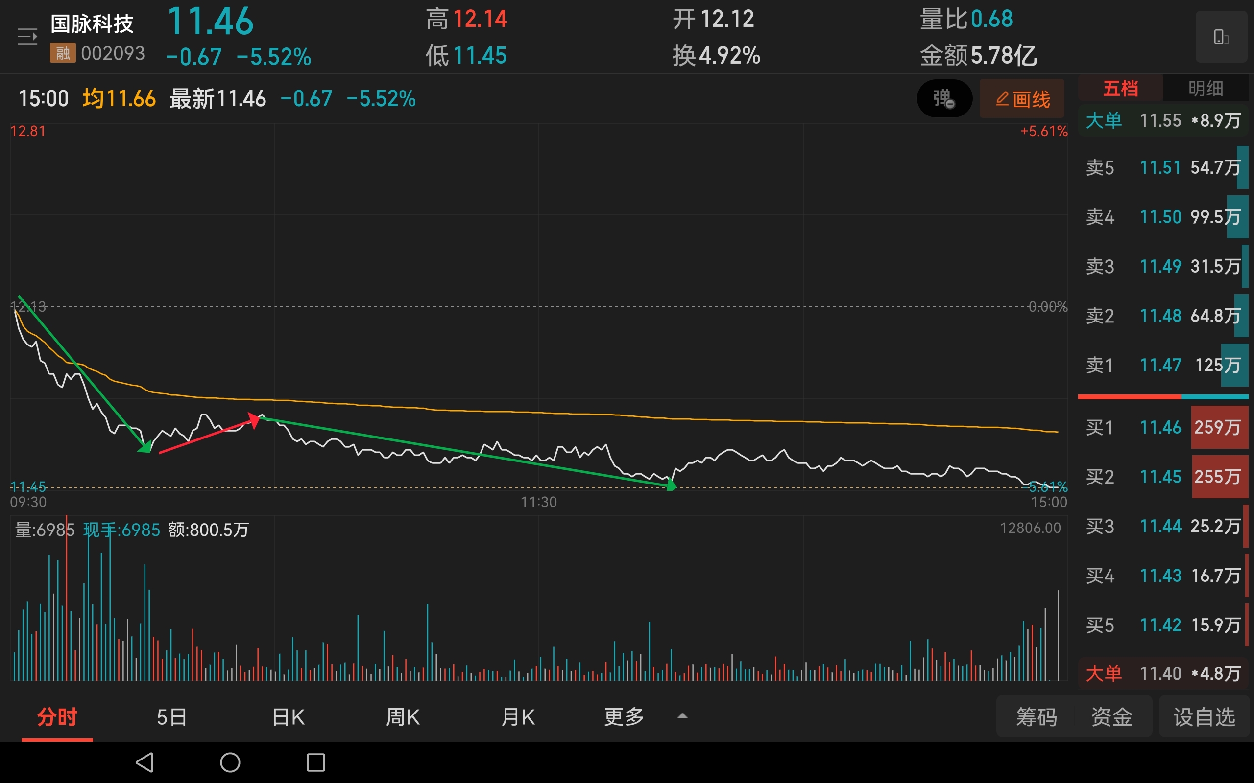 重申之前的观点:不用看日线,容易甩下车。周线、月线都打到关键的支撑位,月线的支撑位在11.29元,跌破11止损。分时图可以对比这两笔下跌的力度和幅度,第二笔明显减弱,第一笔下跌是明显带量的,这个量既是出货量也是接量,试问散户敢接吗?尾盘最后也是带量的,但是股价横住了,散户能让股价横住吗?