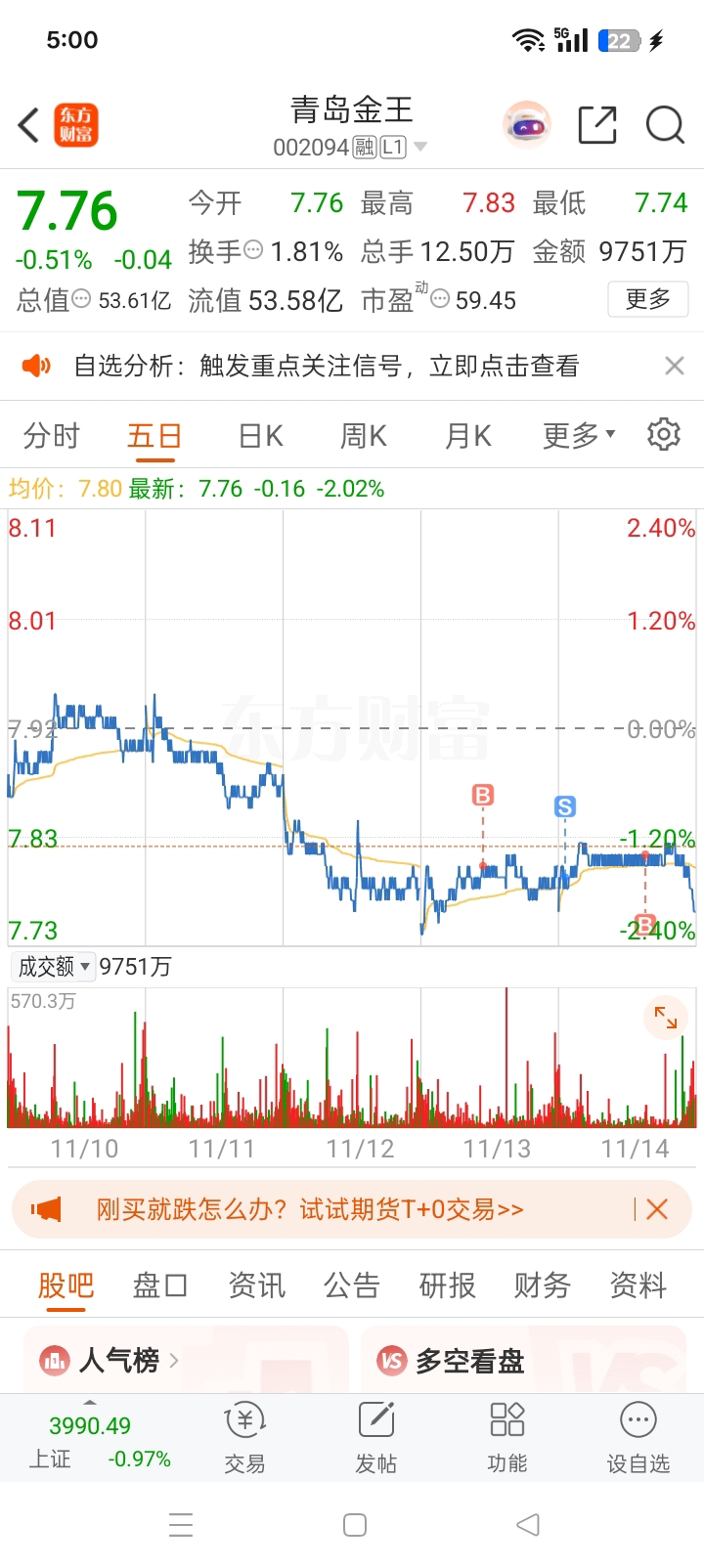 $青岛金王(SZ002094)$ 7.81的本,等多几天看看他跌下来不,我还等着抄底