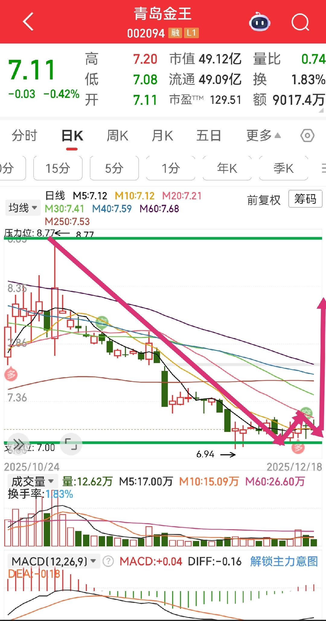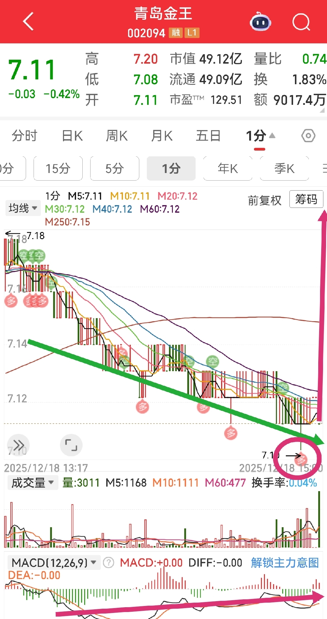$青岛金王(SZ002094)$ 股价运行在智能撑压线之间,冲击压力位8.77元遇阻回落,回抽到智能撑压线的支撑位7.00元获得支撑,今天的下跌震荡引发了1分钟k线图,股价和macd出现下跌背离,后市对应会有1分钟级别的反弹!