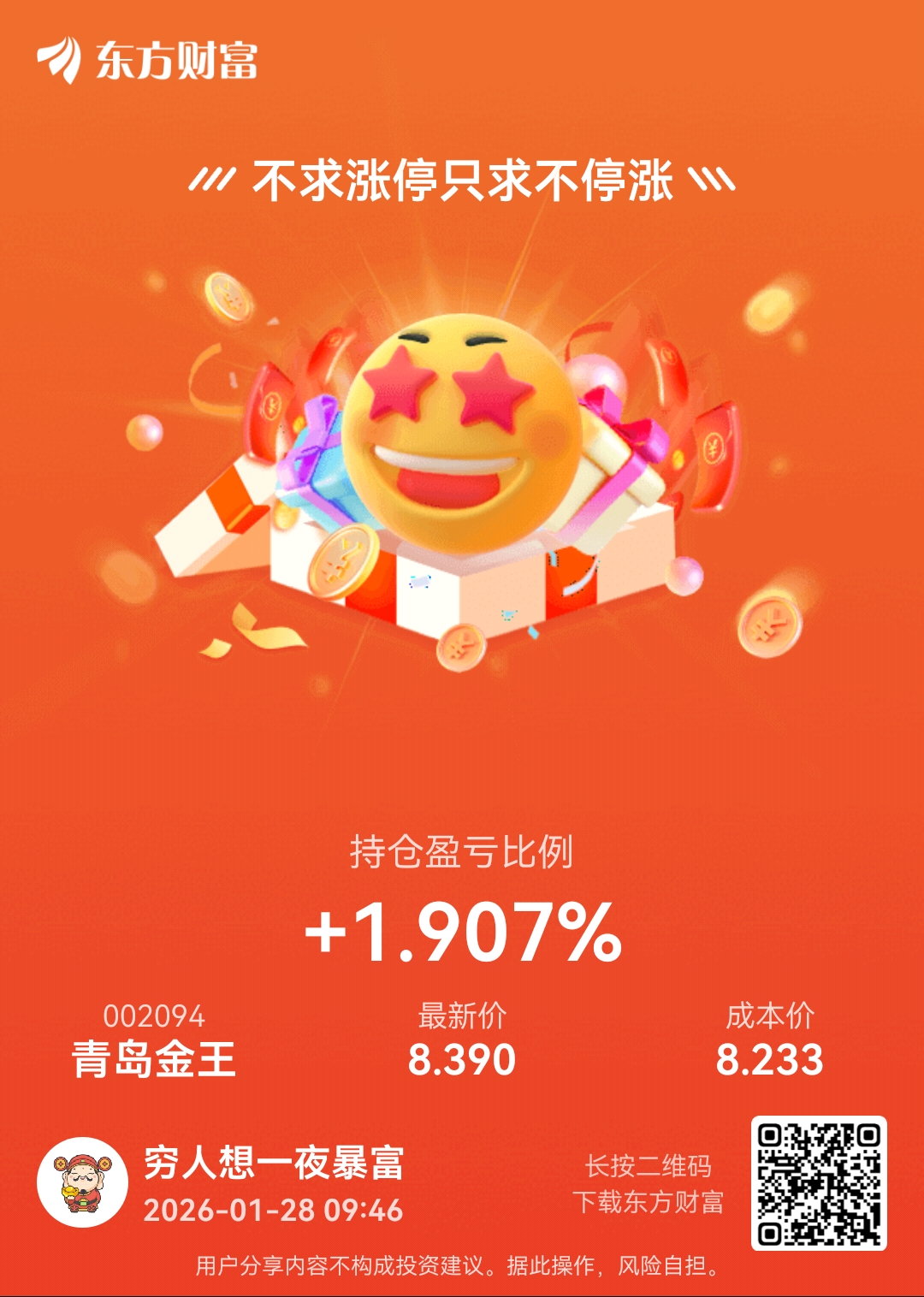 温馨提示: 1.根据《证券法》规定,禁止编造、传播虚假信息或者误导性信息,扰乱证券市场;2.用户在本社区发表的所有资料、言论等仅代表个人观点,与本网站立场无关,不对您构成任何投资建议。用户应基于自己的独立判断,自行决定证券投资并承担相应风险。《东方财富社区管理规定》
