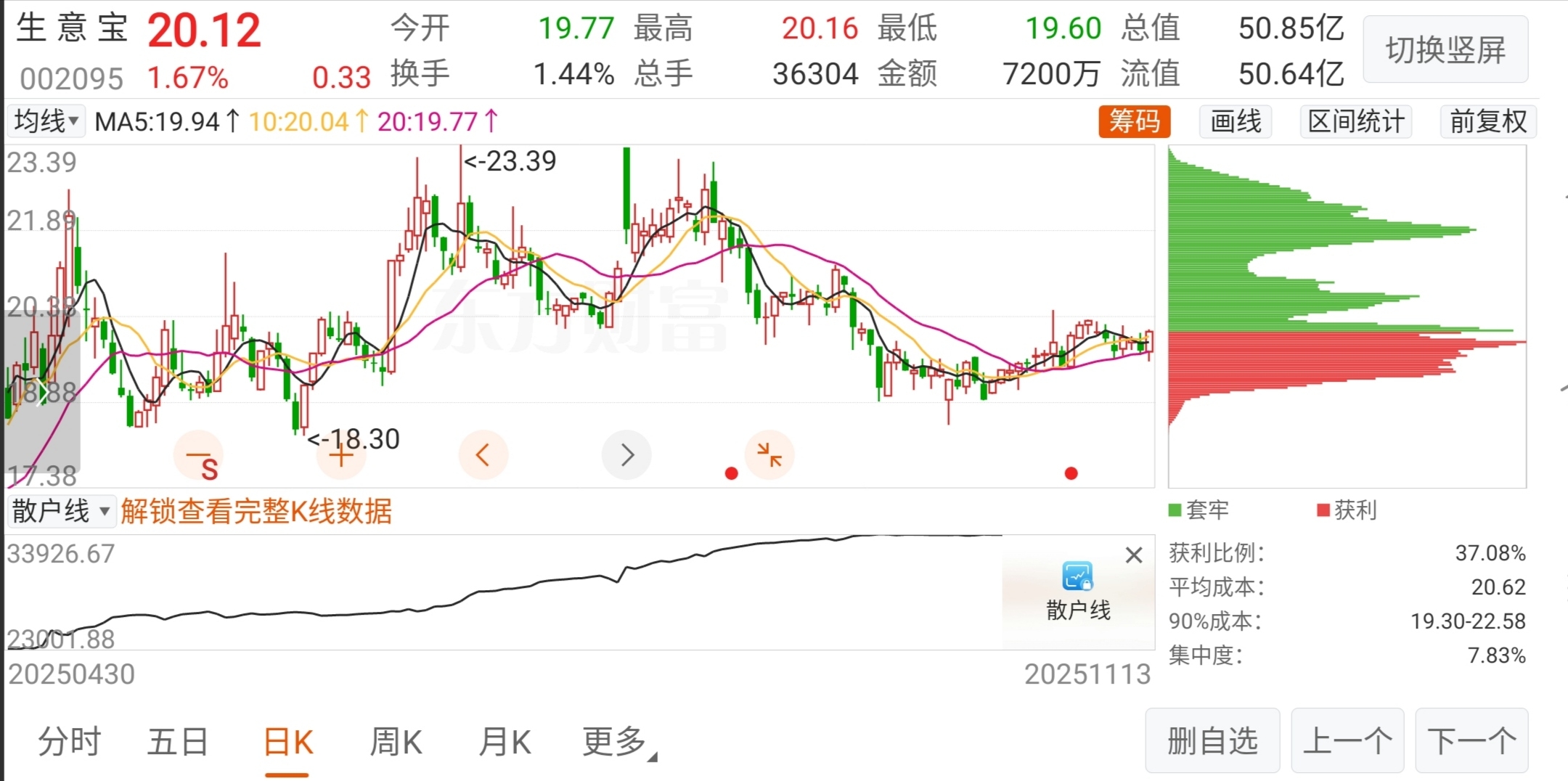 $生 意 宝(SZ002095)$ 就这个筹码分布,上边一堆套牢盘,涨不上去的,进一退二,暴跌倒是有可能