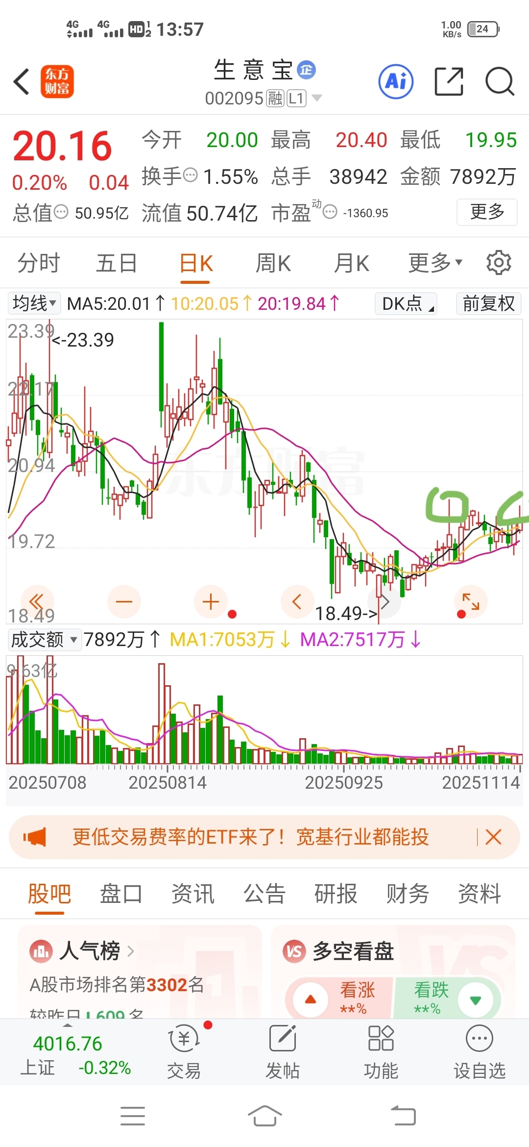 $生 意 宝(SZ002095)$ 跑,日线双顶又要回调了