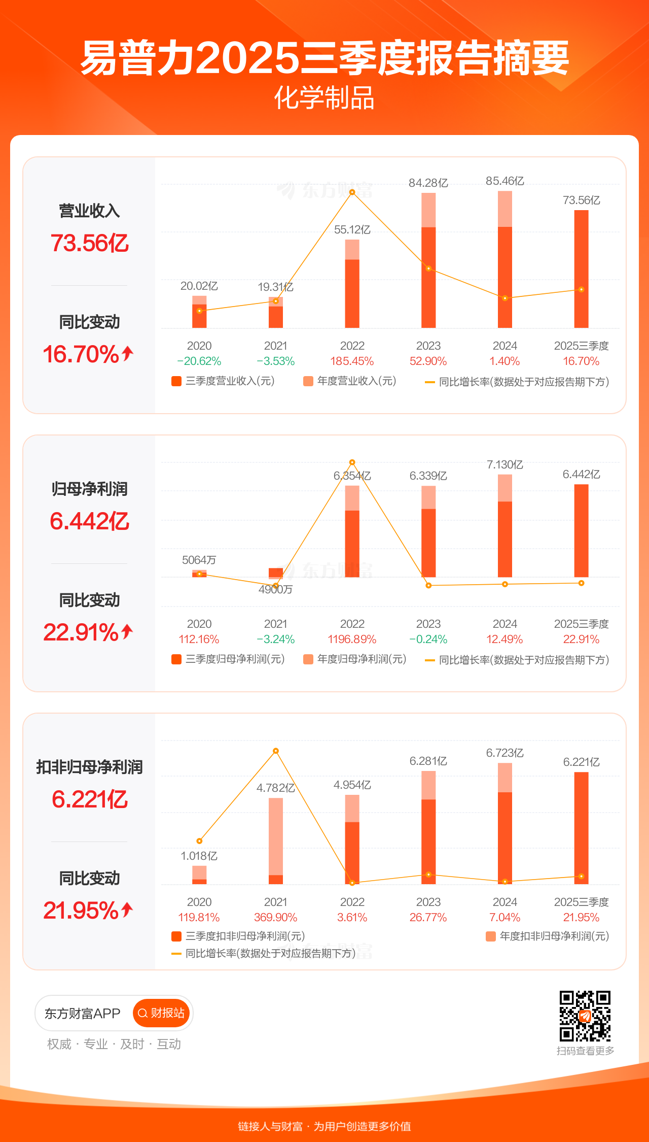 易普力10月31日发布2025年三季报显示,公司前三季实现营业收入73.56亿元,同比增长16.70%;归母净利润6.44亿元,同比增长22.91%;扣非归母净利润6.22亿元,同比增长21.95%。
