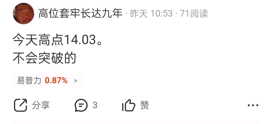$易普力(SZ002096)$ 不突破14.03并站稳,就是今日高点