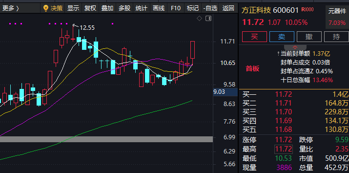 $方正科技(SH600601)$:核心业务主要围绕PCB(印制电路板)的研发、生产和销售,在国内PCB企业中营收规模位居前列,尤其在通讯板领域具备技术积累,客户覆盖华为、中兴等主流设备商;近年来在AI服务器和云计算方向同时发力,三季度业绩高速增长,备受各大基J的青睐,大趋势震荡向上,短期经过一个月的调整,有再次突破前高的预期,周五虽然封板,但左侧压力也较为明显,反复在板价折腾,今天二种应对方案:一是快速且有效突破前高12.55看一进二预期,小仓跟进;二是低开后在11.3左右企稳小仓位低吸,否则就再次等待其他低吸点。