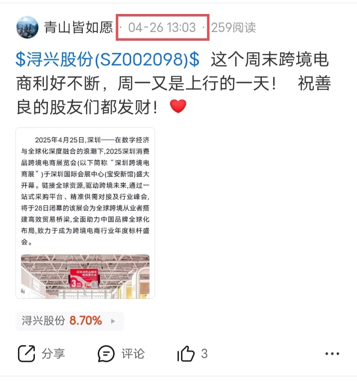 上周末发帖说【浔兴股份】周一会继续上行,今日果然大涨!
