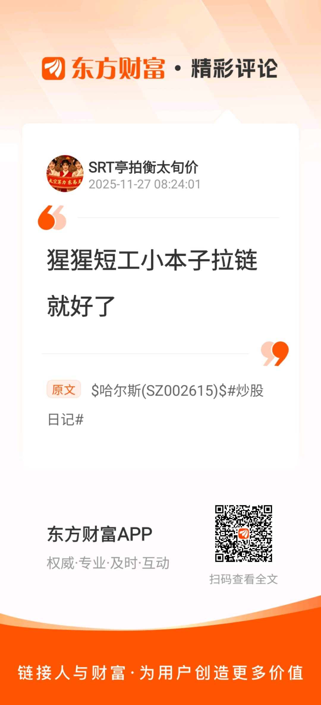 温馨提示: 1.根据《证券法》规定,禁止编造、传播虚假信息或者误导性信息,扰乱证券市场;2.用户在本社区发表的所有资料、言论等仅代表个人观点,与本网站立场无关,不对您构成任何投资建议。用户应基于自己的独立判断,自行决定证券投资并承担相应风险。《东方财富社区管理规定》