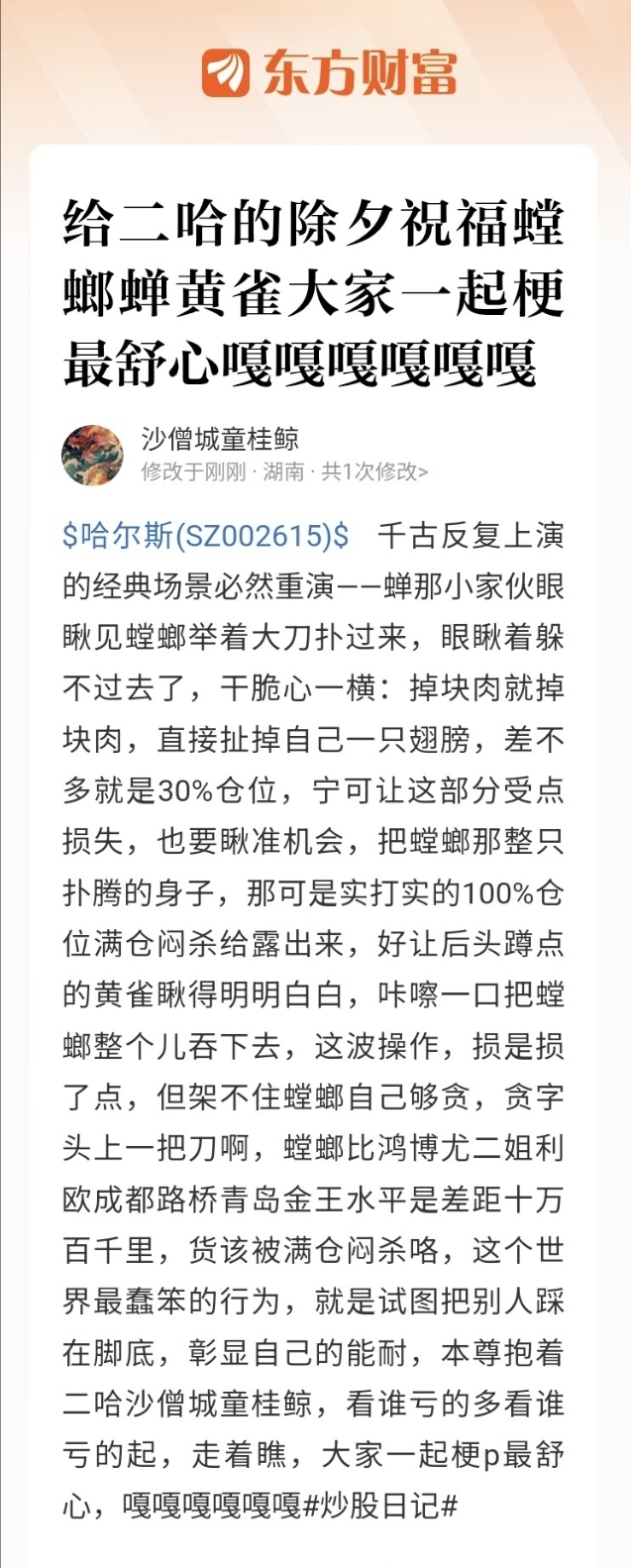 温馨提示: 1.根据《证券法》规定,禁止编造、传播虚假信息或者误导性信息,扰乱证券市场;2.用户在本社区发表的所有资料、言论等仅代表个人观点,与本网站立场无关,不对您构成任何投资建议。用户应基于自己的独立判断,自行决定证券投资并承担相应风险。《东方财富社区管理规定》