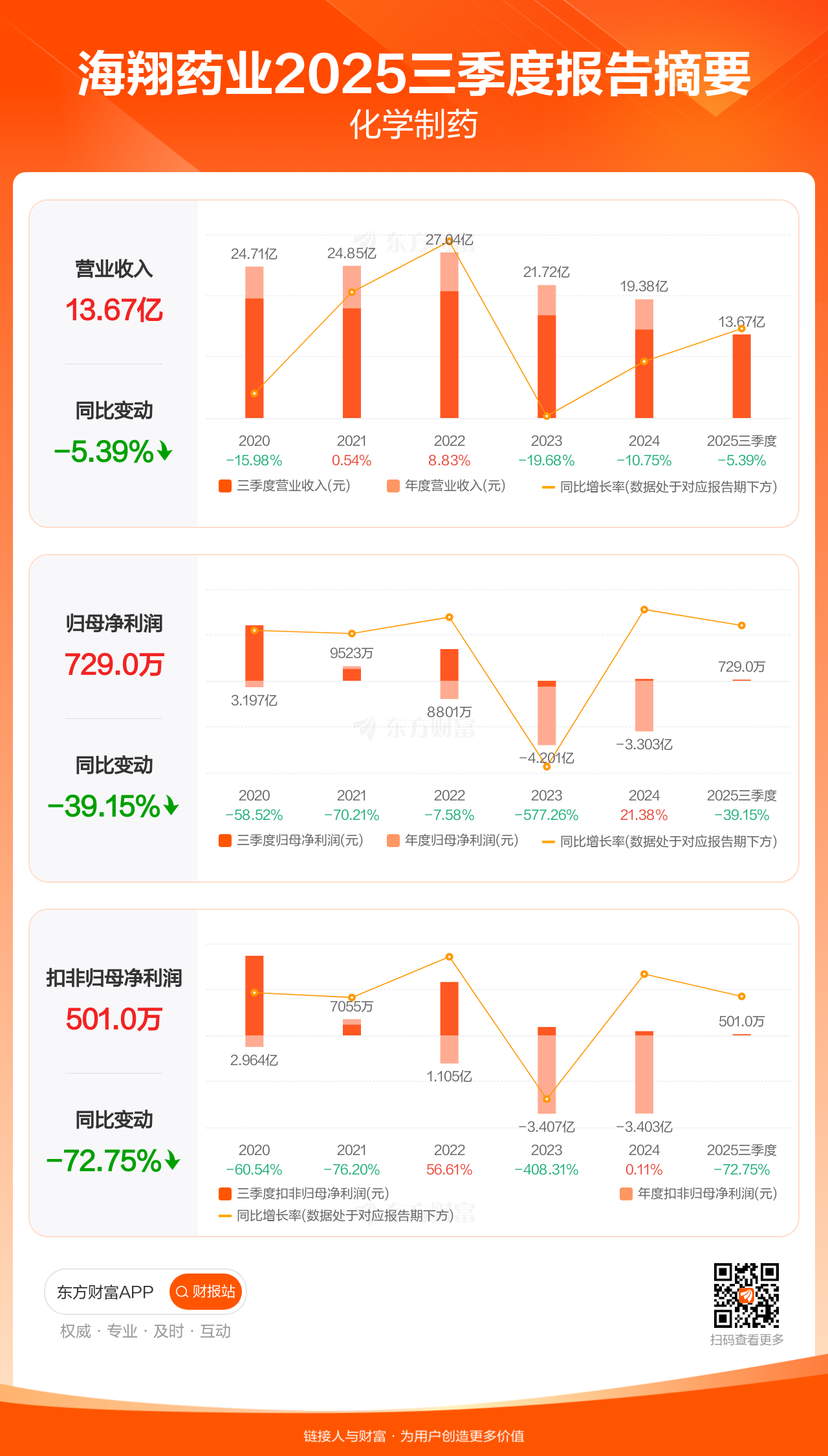 海翔药业10月29日发布2025年三季报显示,公司前三季实现营业收入13.67亿元,同比下滑5.39%;归母净利润729.03万元,同比下滑39.15%;扣非归母净利润501.05万元,同比下滑72.75%。