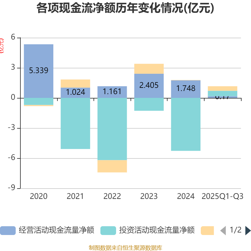 2025年前三季度,公司经营活动现金流净额为1695.76万元,同比下降87.84%;筹资活动现金流净额4540.92万元,同比增加1.34亿元;投资活动现金流净额5368.72万元,上年同期为-1.05亿元。