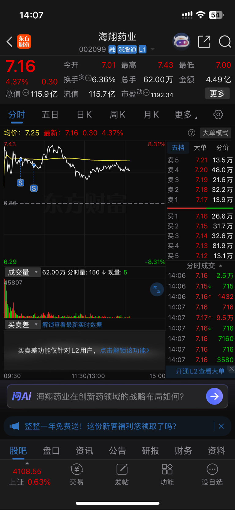 $海翔药业(SZ002099)$ 这主力不想涨,清仓了,早上涨停,周一溢价妥妥的
