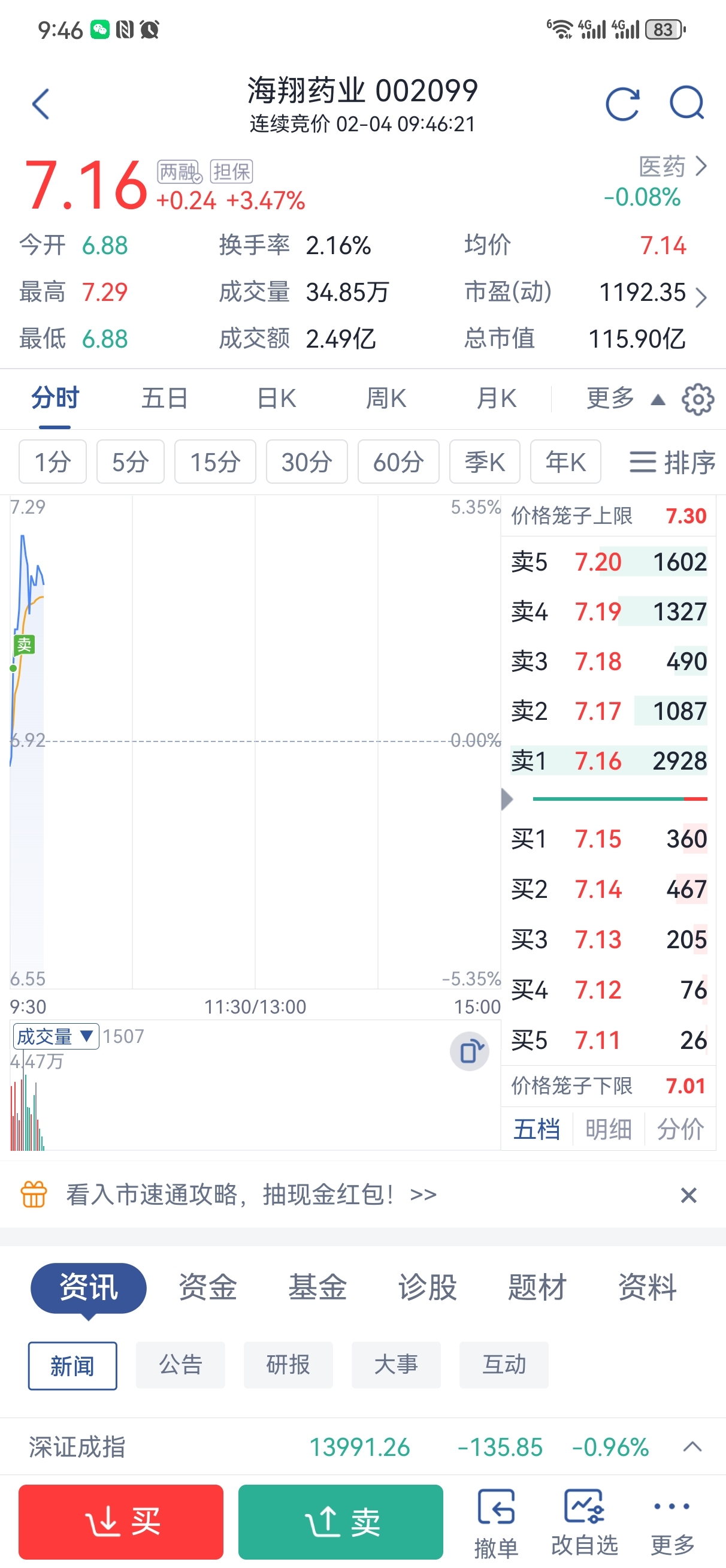 $海翔药业(SZ002099)$ 被猴儿耍了,这几天7块附近,一直有大单压盘,今天早上又压又撤单