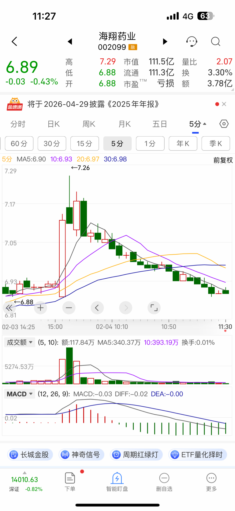 $海翔药业(SZ002099)$ 就是在出货!五分钟线可以看出来!