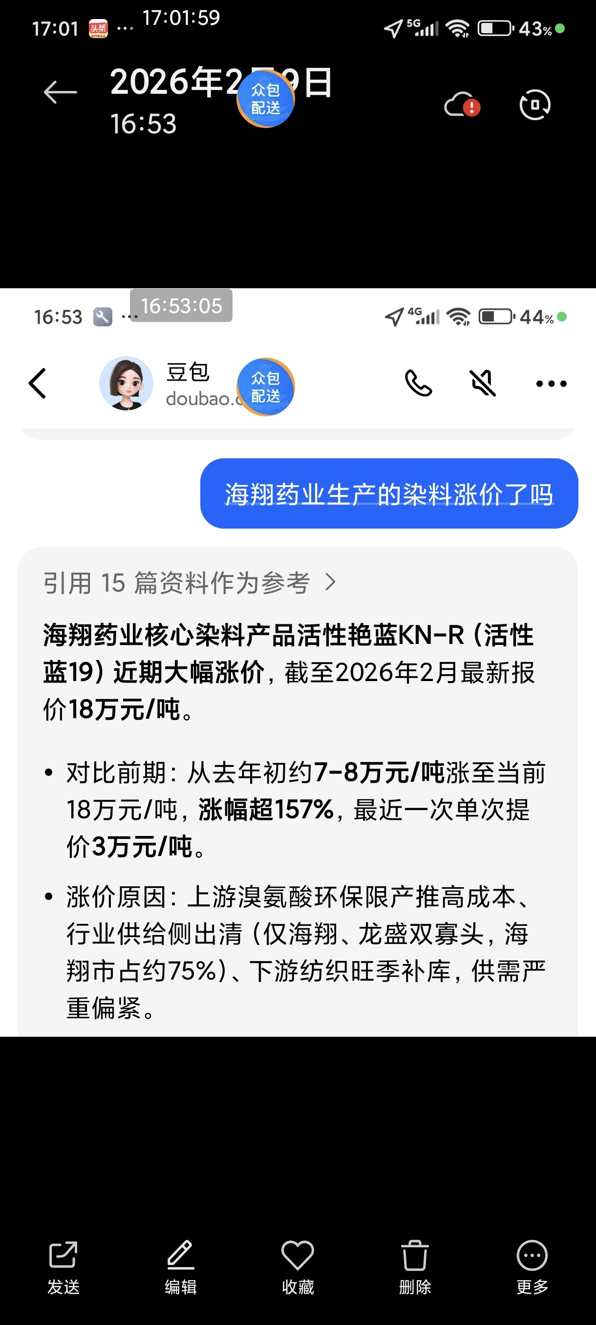 梁料活性艳蓝KN-R市场大幅涨价,从去年同期7万/吨上涨到今年15万/吨,而该染料海翔一家占率就高达75%,这下发财了,难怪今天千手哥抛压被主力全部没收
