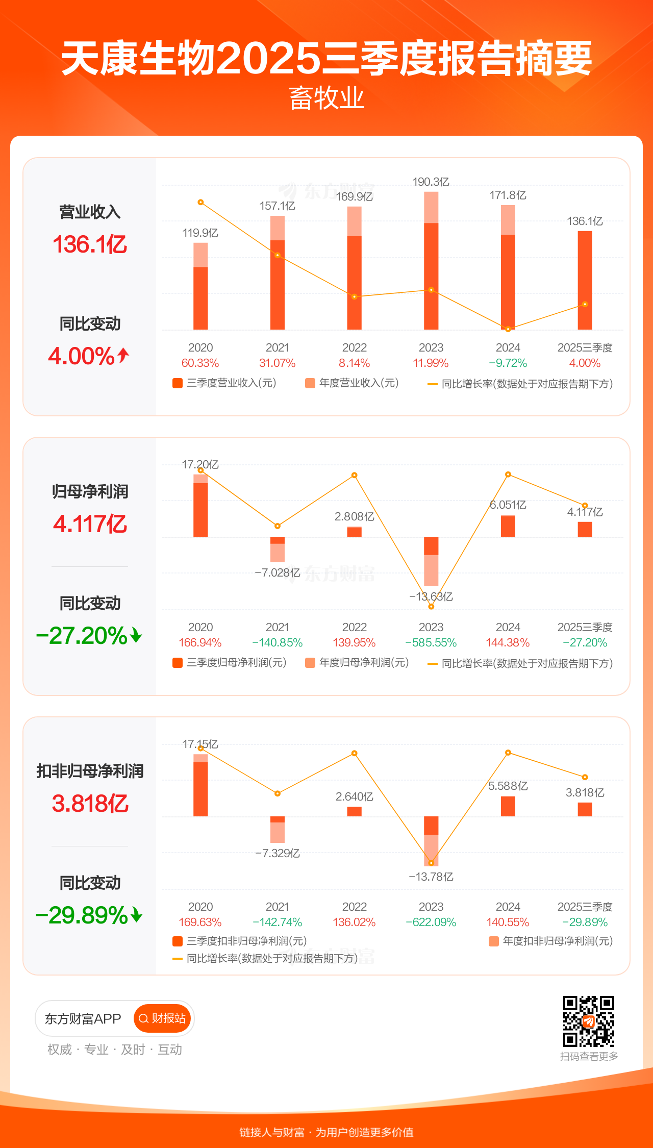 天康生物10月30日发布2025年三季报显示,公司前三季实现营业收入136.10亿元,同比增长4.00%;归母净利润4.12亿元,同比下滑27.20%;扣非归母净利润3.82亿元,同比下滑29.89%。