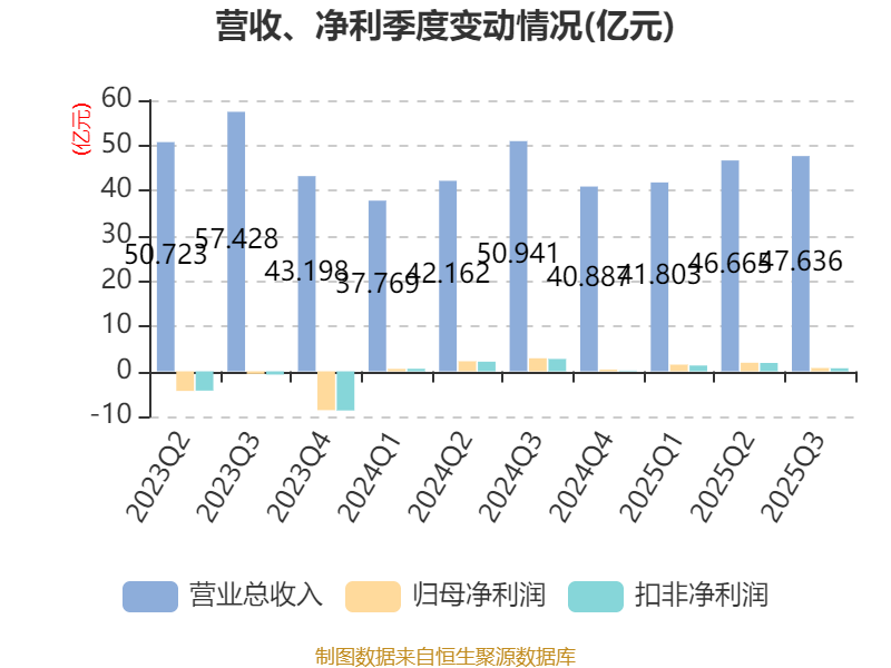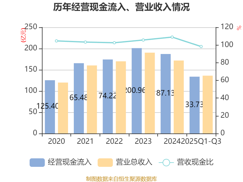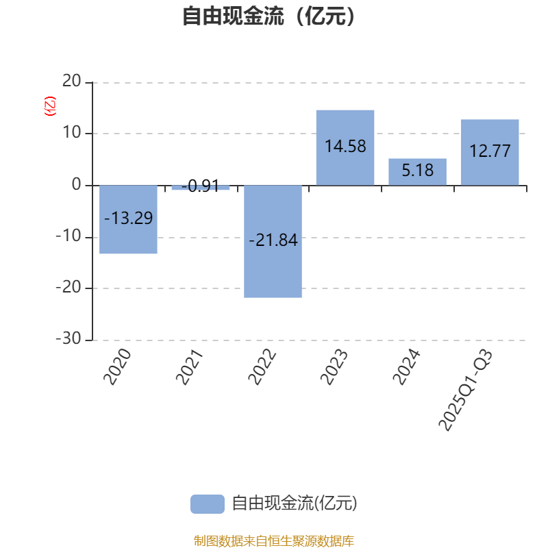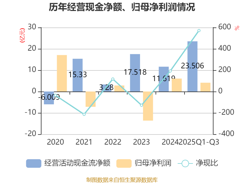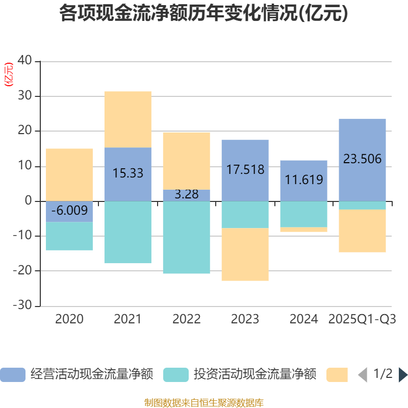 2025年前三季度,公司经营活动现金流净额为23.51亿元,同比增长9.56%;筹资活动现金流净额-12.21亿元,同比减少4.38亿元;投资活动现金流净额-2.42亿元,上年同期为-5.53亿元。