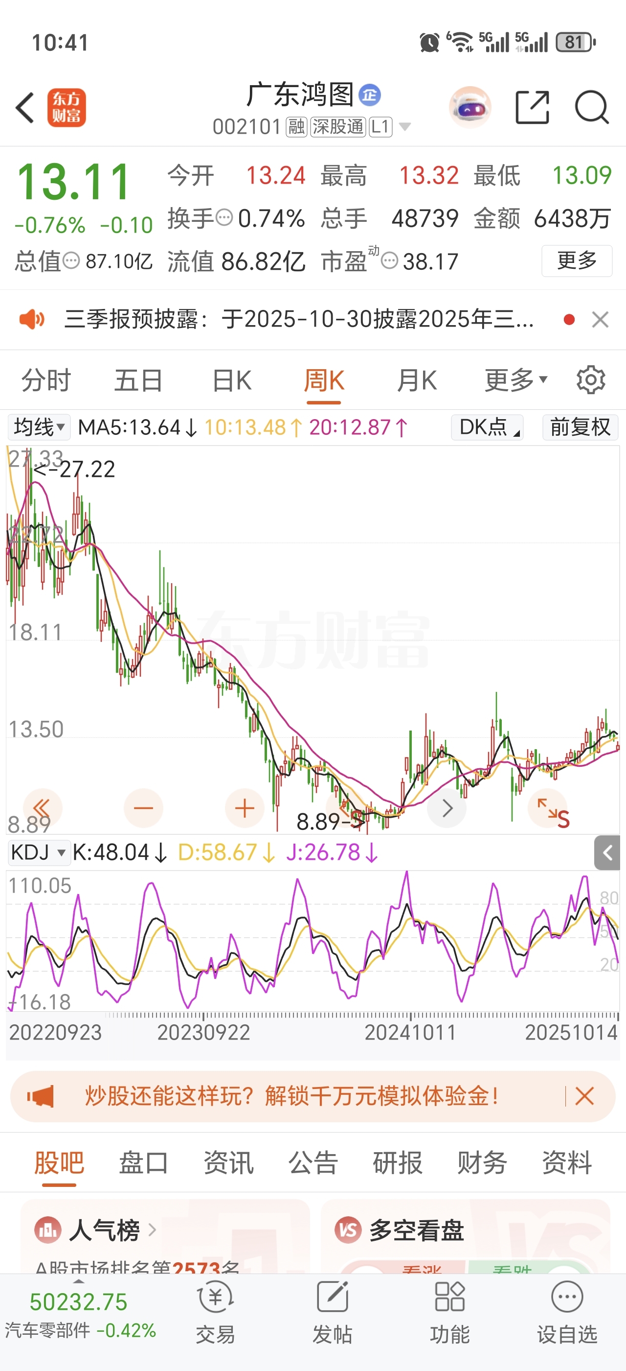 $广东鸿图(SZ002101)$ 躲牛市一流,大盘3900,这里多少了