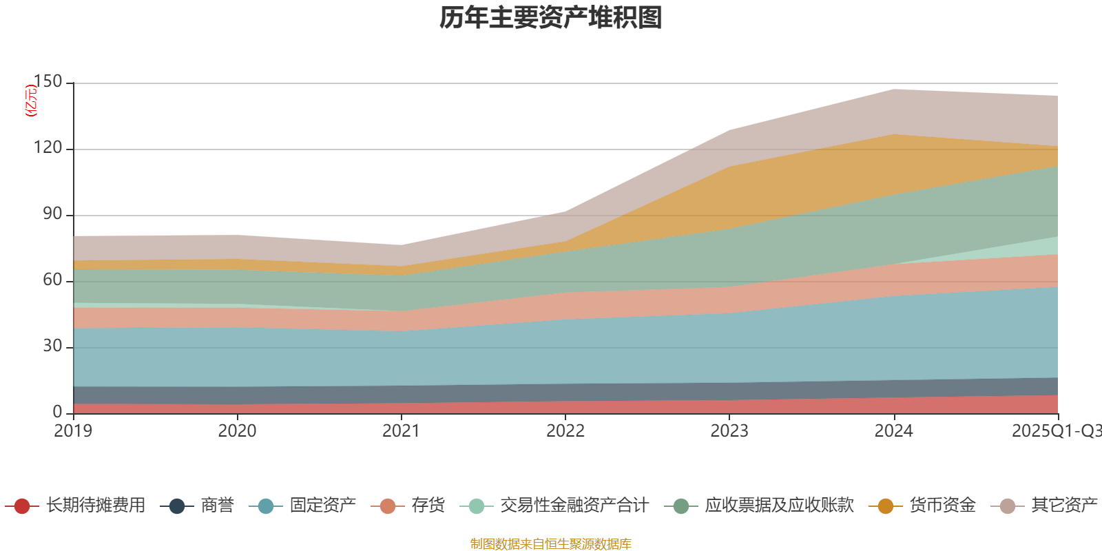 资产重大变化方面,截至2025年三季度末,公司货币资金较上年末减少66.97%,占公司总资产比重下降12.34个百分点;交易性金融资产合计占公司总资产的5.56%,上年末为0;固定资产较上年末增加7.92%,占公司总资产比重上升2.65个百分点;在建工程合计较上年末增加59.98%,占公司总资产比重上升0.9个百分点。