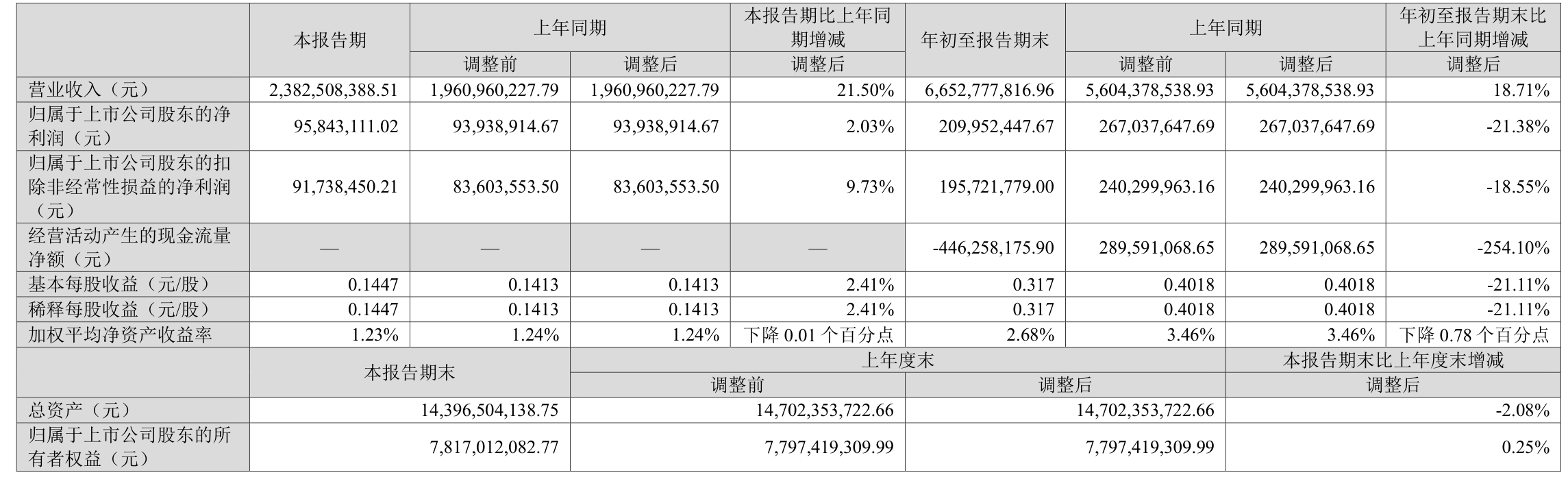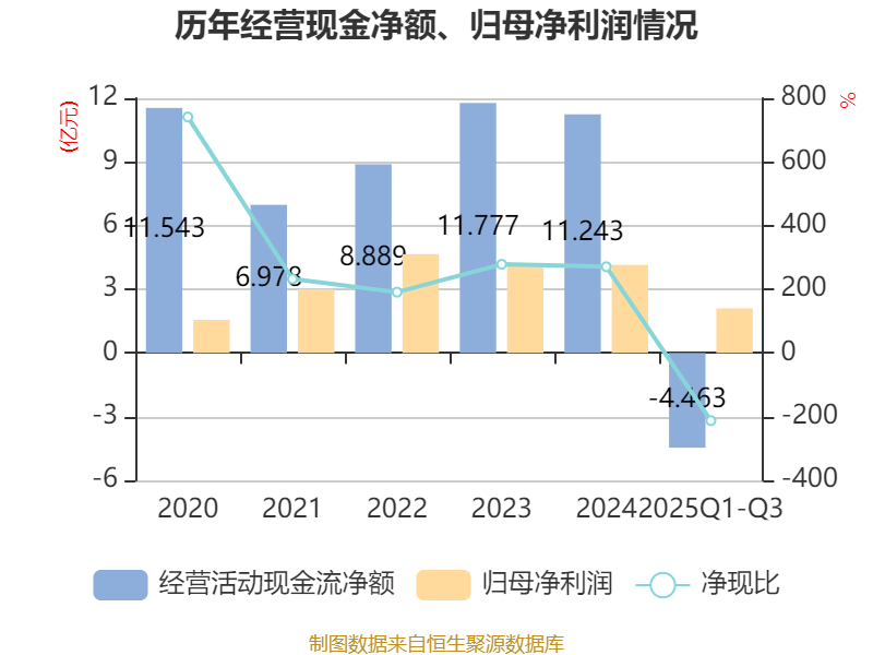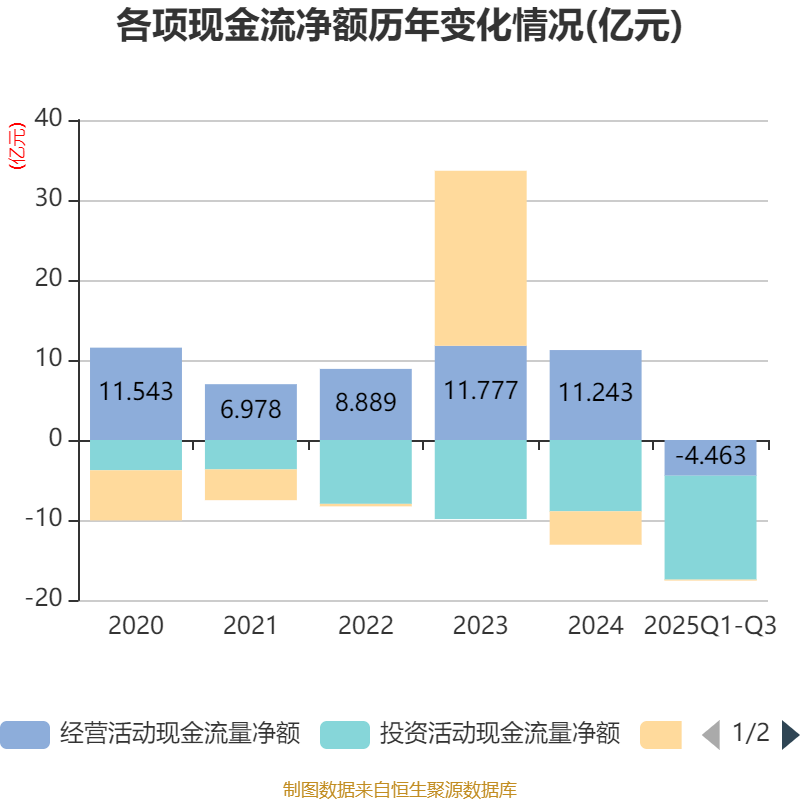 2025年前三季度,公司经营活动现金流净额为-4.46亿元,同比减少7.36亿元;筹资活动现金流净额-1215.08万元,同比增加2.14亿元;投资活动现金流净额-12.99亿元,上年同期为-5.29亿元。