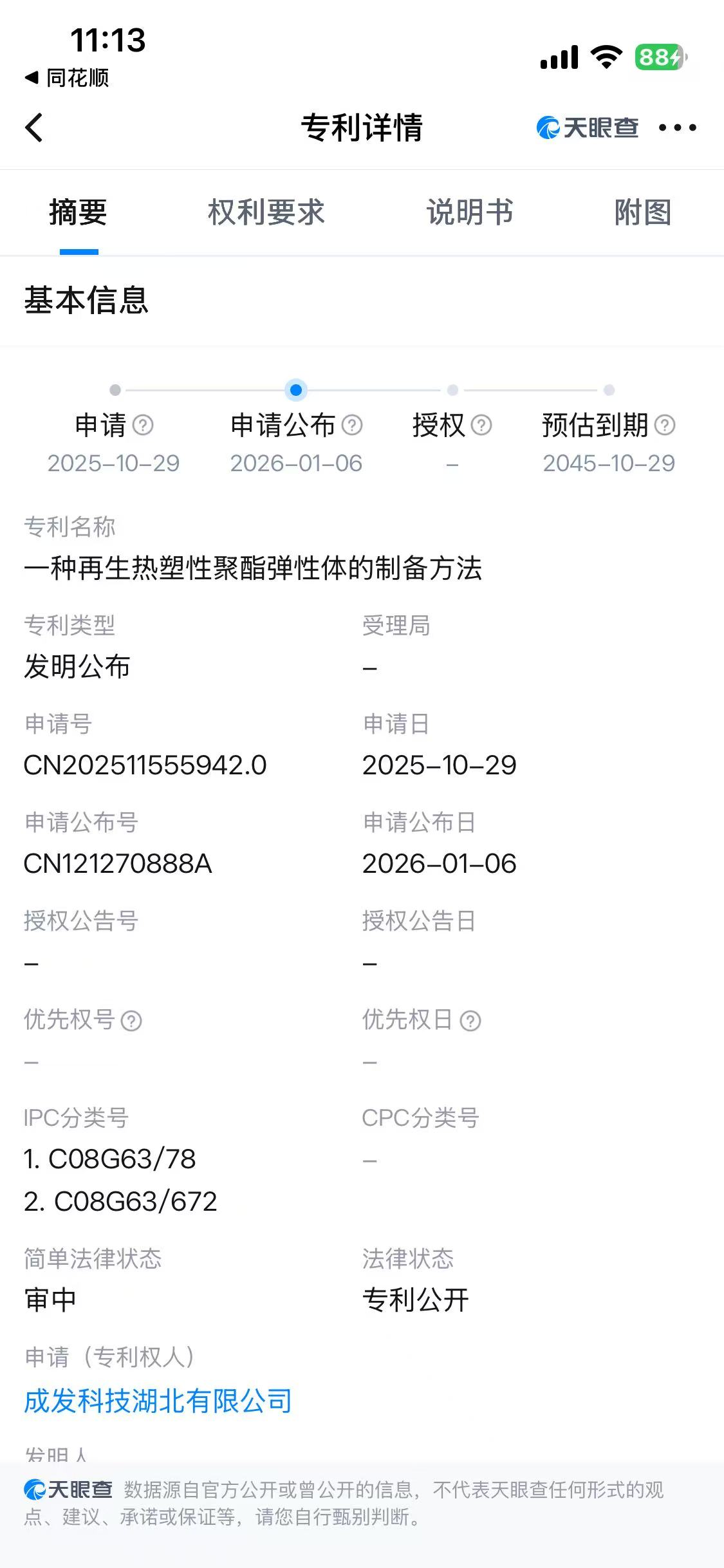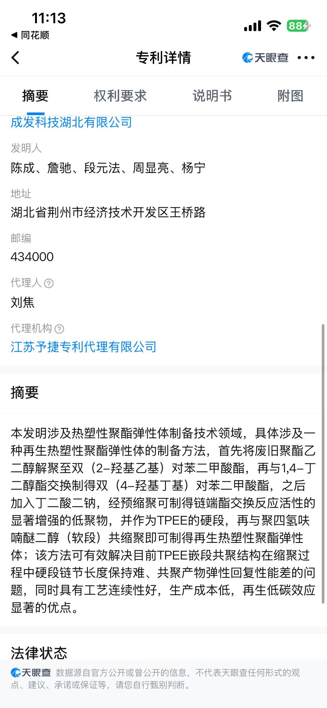 成发科技申请了一种再生热塑性聚酯弹性体的制备方法专利,2025-10月申请,昨天2026-01申请公布。