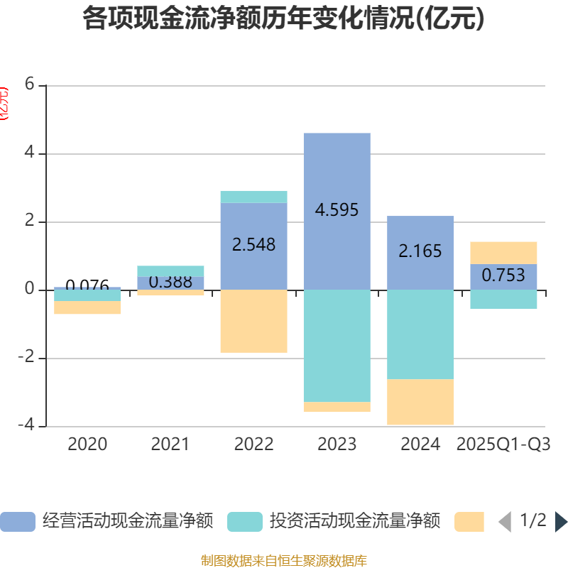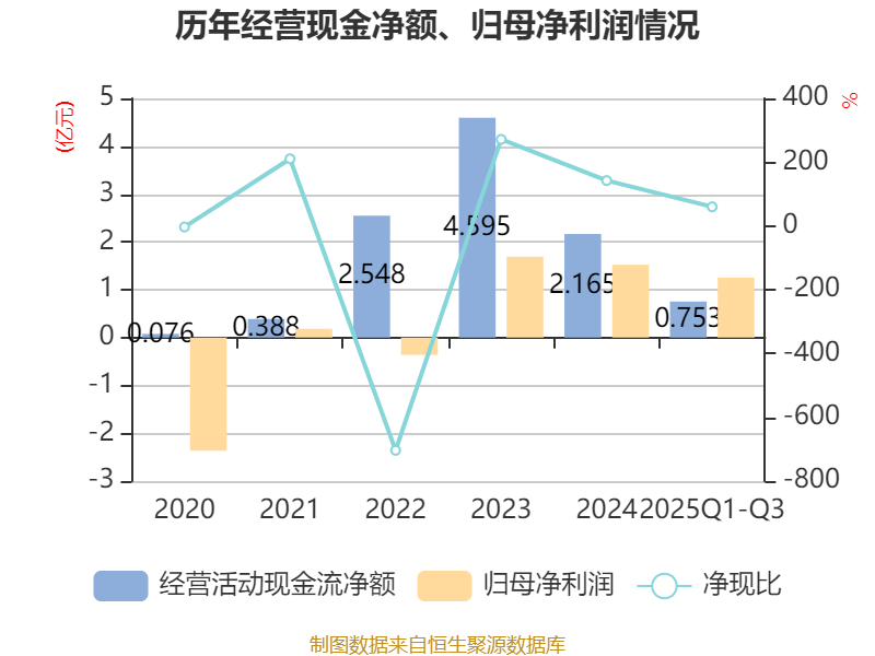 2025年前三季度,公司经营活动现金流净额为7530.89万元,同比增长189.99%;筹资活动现金流净额6512.45万元,同比增加1.51亿元;投资活动现金流净额-5619.32万元,上年同期为-7760.47万元。