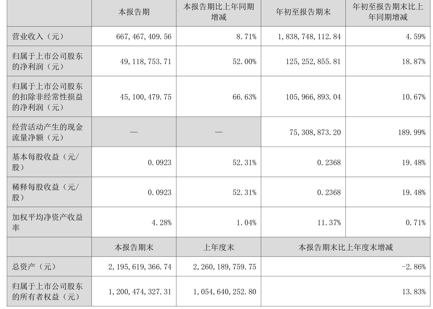 中证智能财讯广博股份(002103)10月30日披露2025年第三季度报告。前三季度公司实现营业总收入18.39亿元,同比增长4.59%;归母净利润1.25亿元,同比增长18.87%;扣非净利润1.06亿元,同比增长10.67%;经营活动产生的现金流量净额为7530.89万元,同比增长189.99%;报告期内,广博股份基本每股收益为0.2368元,加权平均净资产收益率为11.37%。
