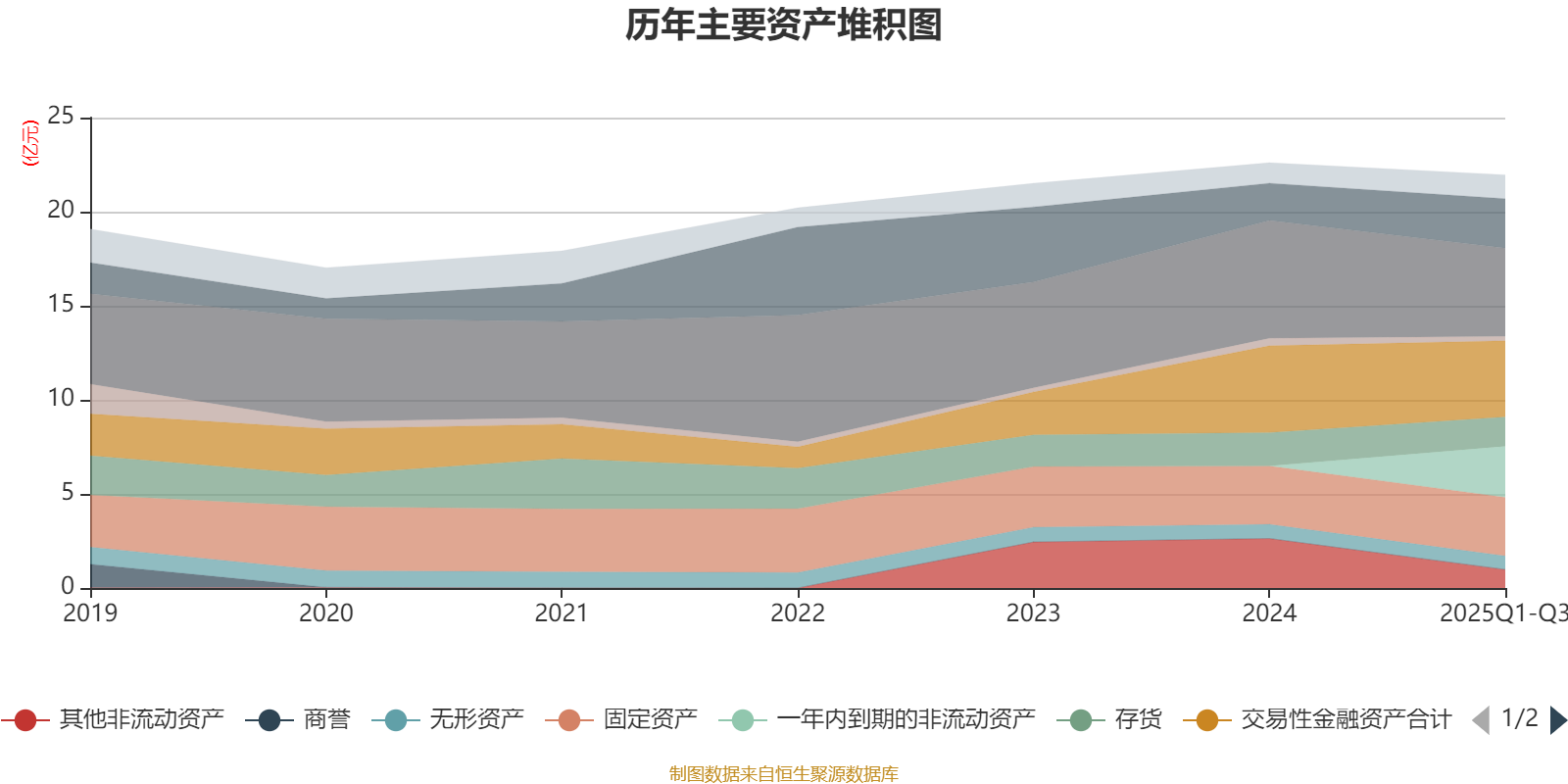 资产重大变化方面,截至2025年三季度末,公司一年内到期的非流动资产占公司总资产的12.33%,上年末为0;其他非流动资产较上年末减少62.71%,占公司总资产比重下降7.17个百分点;应收票据及应收账款较上年末减少25.05%,占公司总资产比重下降6.33个百分点;货币资金较上年末增加33.2%,占公司总资产比重上升3.24个百分点。