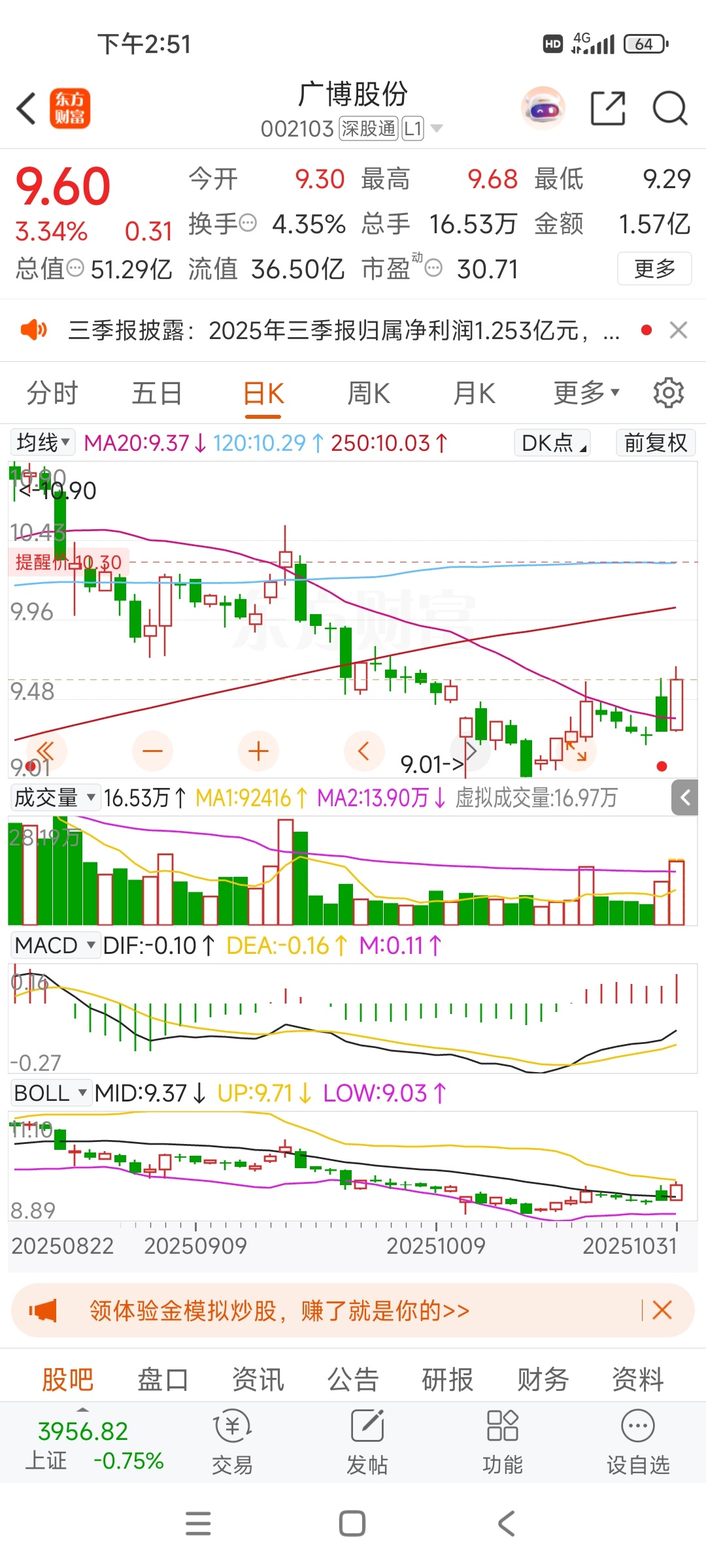 $广博股份(SZ002103)$ 20天线即将拐头向上,连续两天放量,业绩不差,看好一波反弹!!!