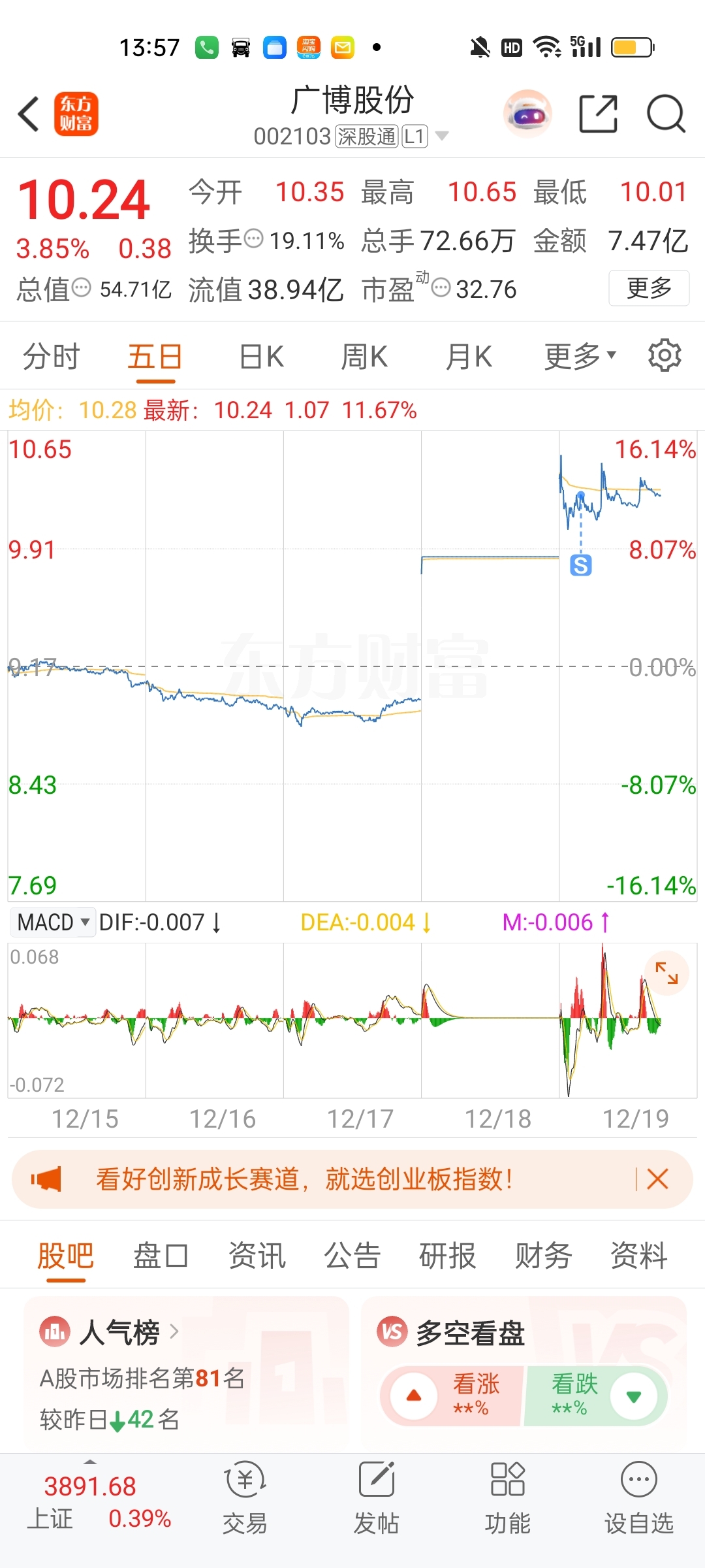 $广博股份(SZ002103)$ 早上睡过头了不然冲高高低得砸一手