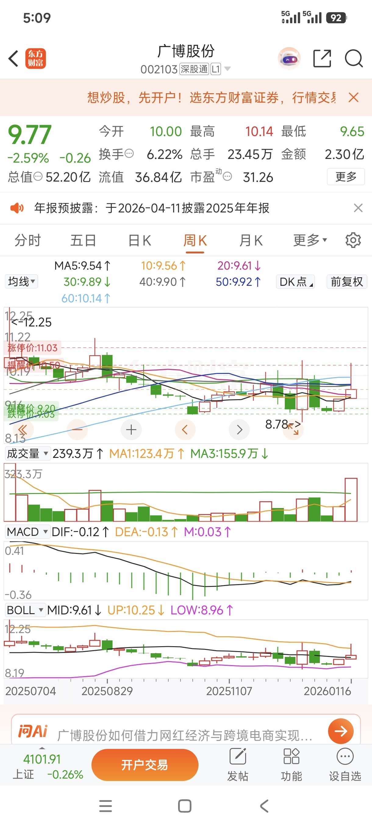 $广博股份(SZ002103)$ 周K线还好,上方10.5元附近有压力,一旦放量站稳10.5元,有望连续涨停!!