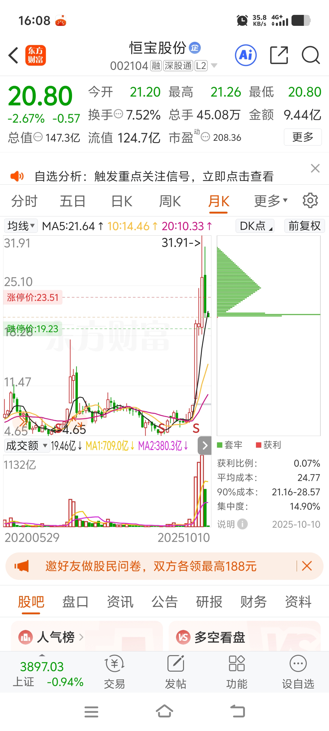 $恒宝股份(SZ002104)$ 20.9我都被套看外围明天估计还得下去