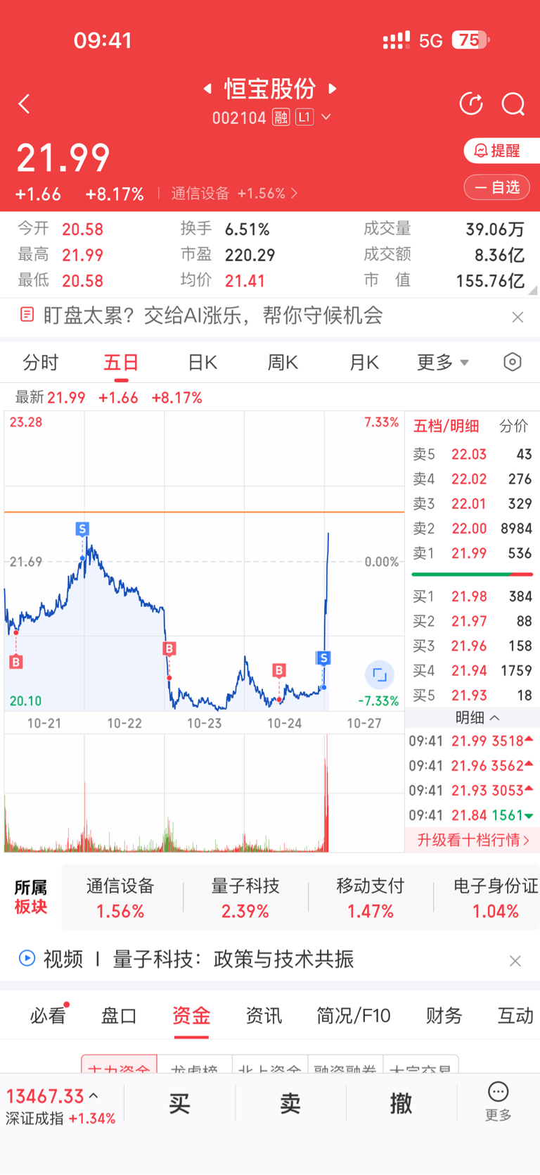 $恒宝股份(SZ002104)$ 礼拜五精准卖飞