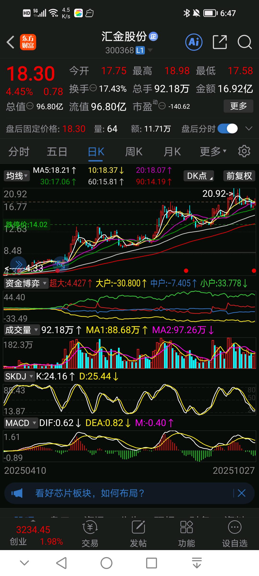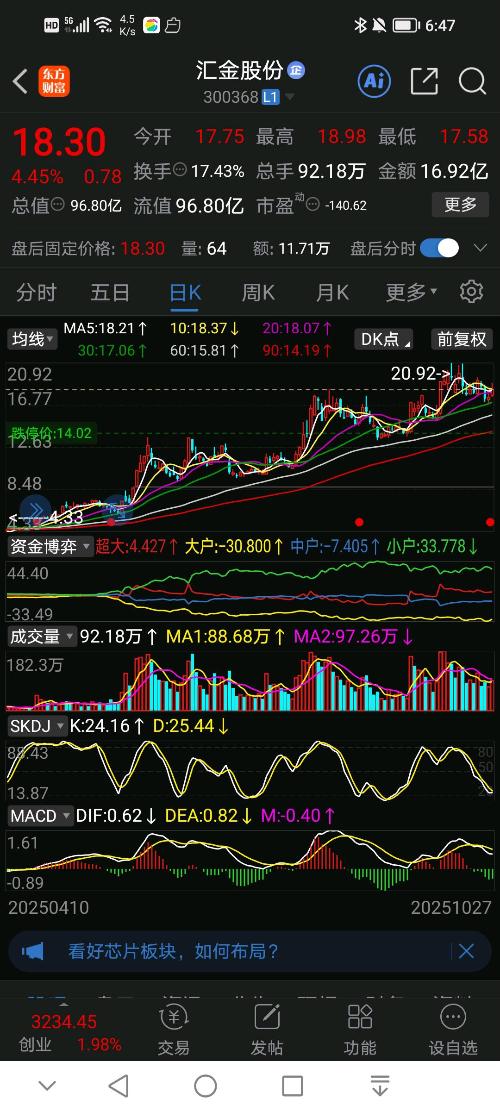 交易是有难度,没有很明朗的走势,是庄股被控盘的走势,时候拉一个20cm涨停,但马上偃旗息鼓,庄家高度控盘,也许未来的哪一年?爆料出来某某某几个账户操控汇金股份,处罚多少,禁入市场多少年…这不是不可能,是很可能会出现的常规现象当然只是猜测别当真,我们做好当下交易,下跌超买敢买就对了,下跌以后敢于捂住,并且低吸加仓前期我们跟踪过,不好意思被赶下车,因为我们是看涨停放量开始重点跟踪的,但是涨停一次后面就不涨,并且还下跌,甚至时间有点长,让您感觉怀疑人生,于是乎放弃了,下车了,不跟你玩行不行?至少懒得跟你浪费时间,吃肉也要换一家去吃肉?当然结局走势也是很显然?股价完成了20元目标,关键气人是刚卖她就涨停了,所以现在回顾历史展望未来,对汇金股份操盘手的操盘手法,性格特征也摸透了,你就是拉一个涨停洗盘慢悠悠上涨,竖一个旗杆就休整队伍巩固后方稳扎稳打秉性。跟着你走。你跌?超买差不多就买,你若涨停?赶在你之前就休整,你大肉?至少汤,小肉不能少,怎么都成草原三哥的德性,专门从母狮嘴下抢块肉吃,狮群底下必有大肉,跟着混肉肉则少不了,跟对了浑水摸鱼都不会差?…不知道是否这么一回事?大家说说你心目中的汇金股份…$恒宝股份(SZ002104)$$汇金股份(SZ300368)$$*ST汇科(SZ300561)$