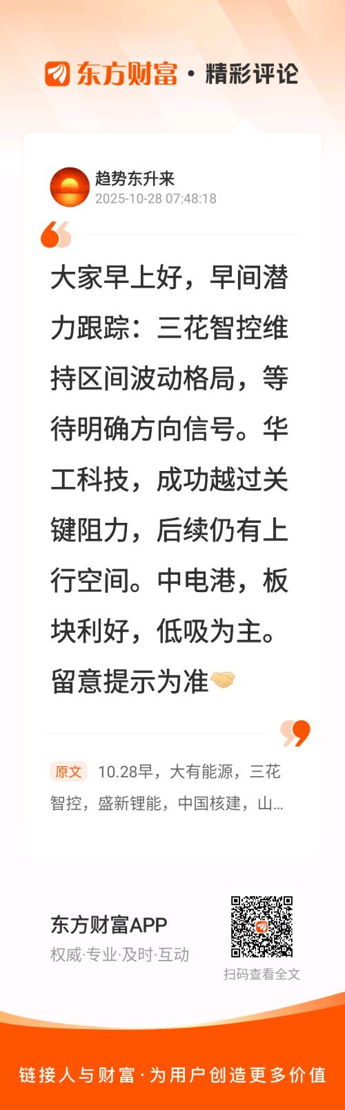 $恒宝股份(SZ002104)$$通富微电(SZ002156)$$厦门钨业(SH600549)$//@趋势东升来 :大家早上好,早间潜力跟踪:三花智控维持区间波动格局,等待明确方向信号。华工科技,成功越过关键阻力,后续仍有上行空间。中电港,板块利好,低吸为主。留意提示为准